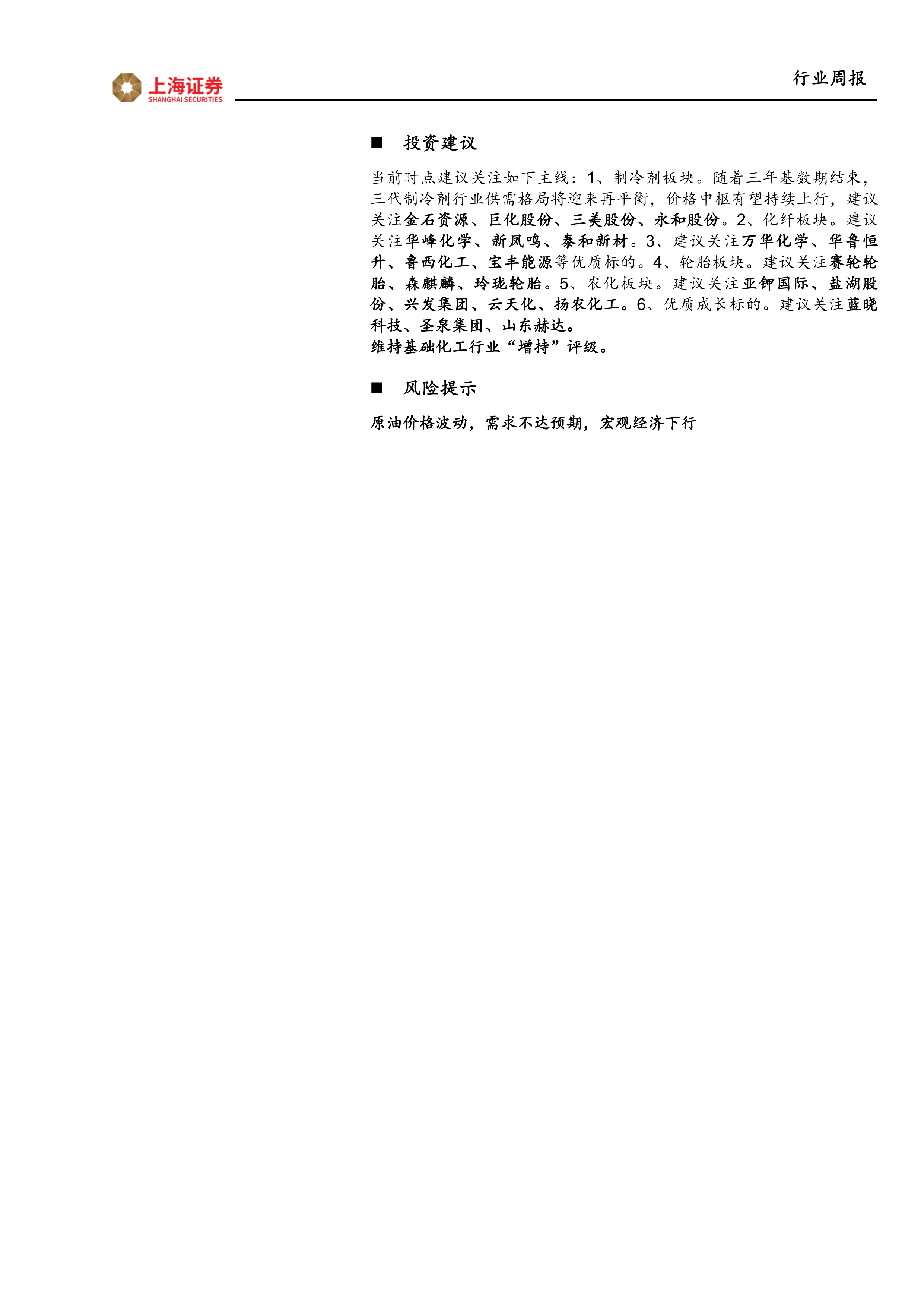 当前时点建议关注如下主线:1、制冷剂板块。随着三年基数期结束,三代制冷剂行业供需格局将迎来再平衡,价格中枢有望持续上行,建议关注金石资源、巨化股份、三美股份、永和股份。2、化纤板块。建议关注华峰化学、新凤鸣、泰和新材。3、建议关注万华化学、华鲁恒升、鲁西化工、宝丰能源等优质标的。4、轮胎板块。建议关注赛轮轮胎、森麒麟、玲珑轮胎。5、农化板块。建议关注亚钾国际、盐湖股份、兴发集团、云天化、扬农化工。6、优质成长标的。建议关注蓝晓科技、圣泉集团、山东赫达。