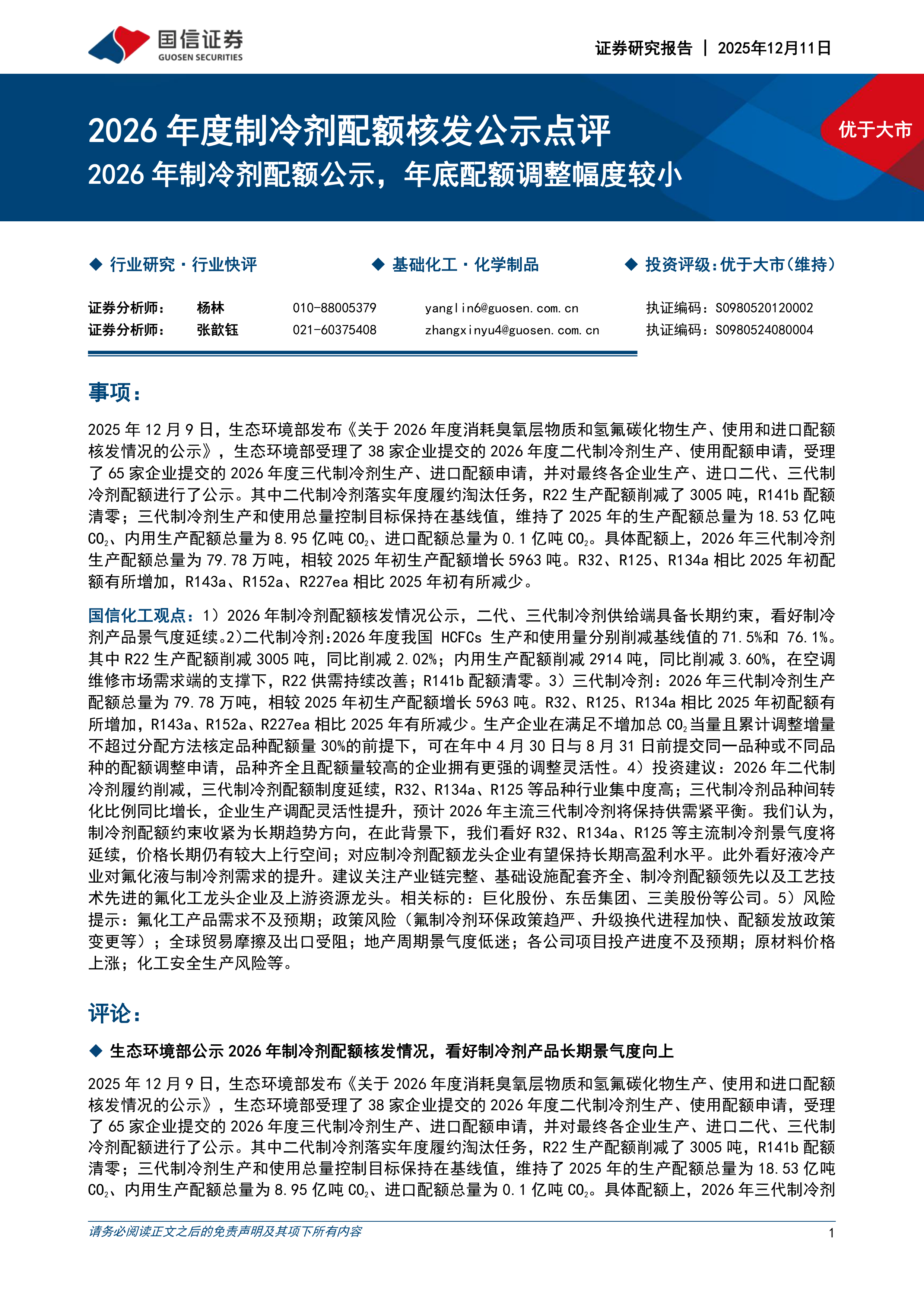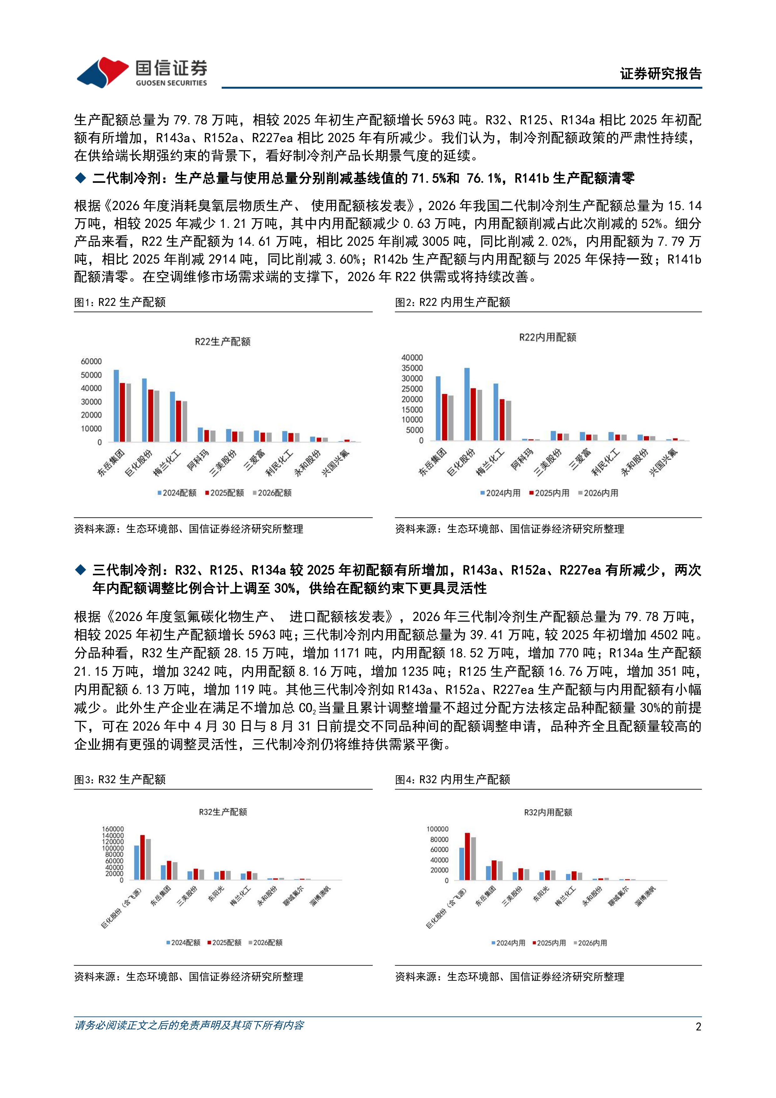 国信化工观点:1)2026年制冷剂配额核发情况公示,二代、三代制冷剂供给端具备长期约束,看好制冷剂产品景气度延续。2)二代制冷剂:2026年度我国HCFCs生产和使用量分别削减基线值的71.5%和76.1%。其中R22生产配额削减3005吨,同比削减2.02%;内用生产配额削减2914吨,同比削减3.60%,在空调维修市场需求端的支撑下,R22供需持续改善;R141b配额清零。3)三代制冷剂:2026年三代制冷剂生产配额总量为79.78万吨,相较2025年初生产配额增长5963吨。R32、R125、R134a相比2025年初配额有所增加,R143a、R152a、R227ea相比2025年有所减少。生产企业在满足不增加总CO2当量且累计调整增量不超过分配方法核定品种配额量30%的前提下,可在年中4月30日与8月31日前提交同一品种或不同品种的配额调整申请,品种齐全且配额量较高的企业拥有更强的调整灵活性。4)投资建议:2026年二代制冷剂履约削减,三代制冷剂配额制度延续,R32、R134a、R125等品种行业集中度高;三代制冷剂品种间转化比例同比增长,企业生产调配灵活性提升,预计2026年主流三代制冷剂将保持供需紧平衡。我们认为,制冷剂配额约束收紧为长期趋势方向,在此背景下,我们看好R32、R134a、R125等主流制冷剂景气度将延续,价格长期仍有较大上行空间;对应制冷剂配额龙头企业有望保持长期高盈利水平。此外看好液冷产业对氟化液与制冷剂需求的提升。建议关注产业链完整、基础设施配套齐全、制冷剂配额领先以及工艺技术先进的氟化工龙头企业及上游资源龙头。相关标的:巨化股份、东岳集团、三美股份等公司。5)风险提示:氟化工产品需求不及预期;政策风险(氟制冷剂环保政策趋严、升级换代进程加快、配额发放政策变更等);全球贸易摩擦及出口受阻;地产周期景气度低迷;各公司项目投产进度不及预期;原材料价格上涨;化工安全生产风险等。