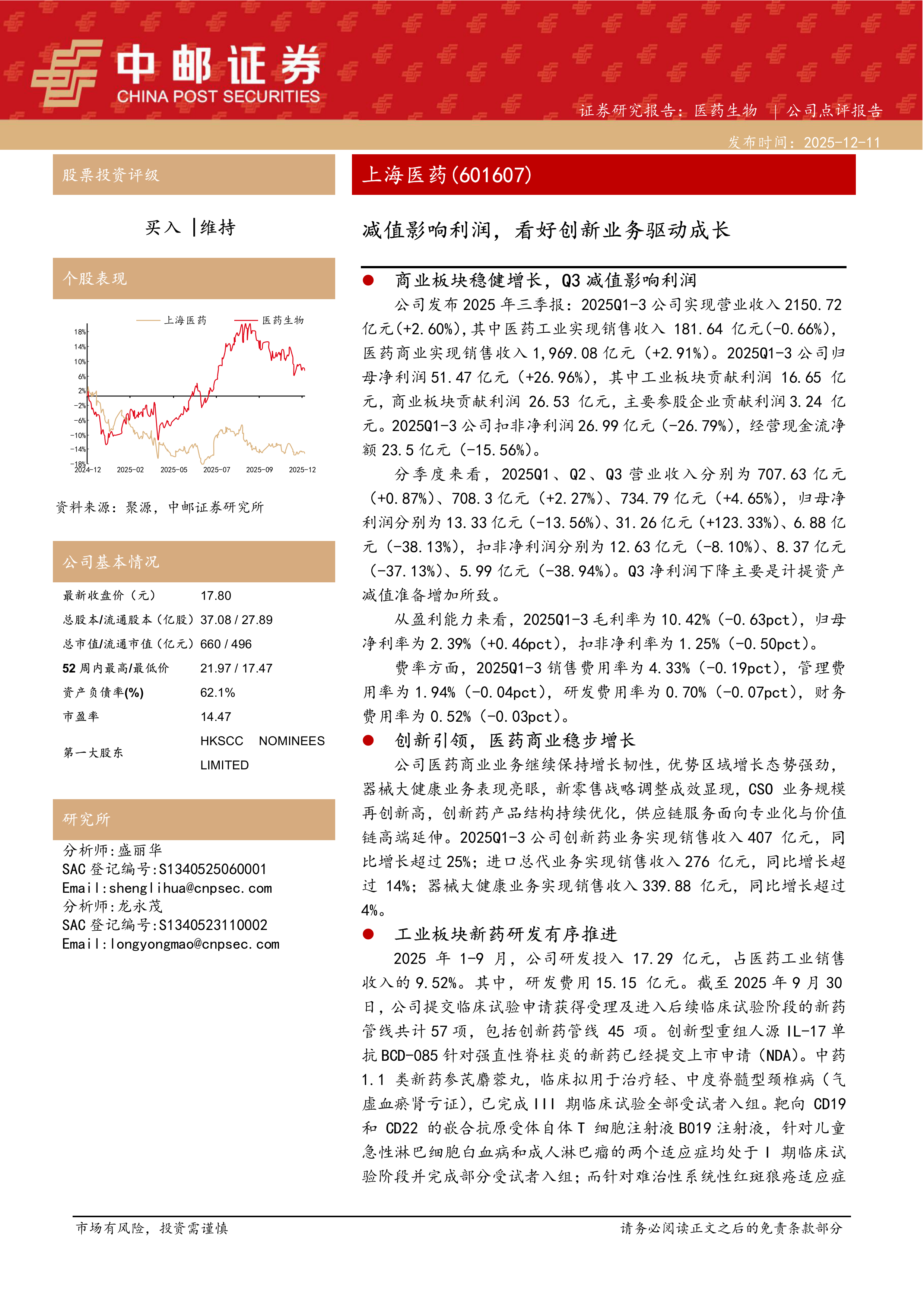 公司发布2025年三季报:2025Q1-3公司实现营业收入2150.72亿元(+2.60%),其中医药工业实现销售收入181.64亿元(-0.66%),医药商业实现销售收入1,969.08亿元(+2.91%)。2025Q1-3公司归母净利润51.47亿元(+26.96%),其中工业板块贡献利润16.65亿元,商业板块贡献利润26.53亿元,主要参股企业贡献利润3.24亿元。2025Q1-3公司扣非净利润26.99亿元(-26.79%),经营现金流净额23.5亿元(-15.56%)。