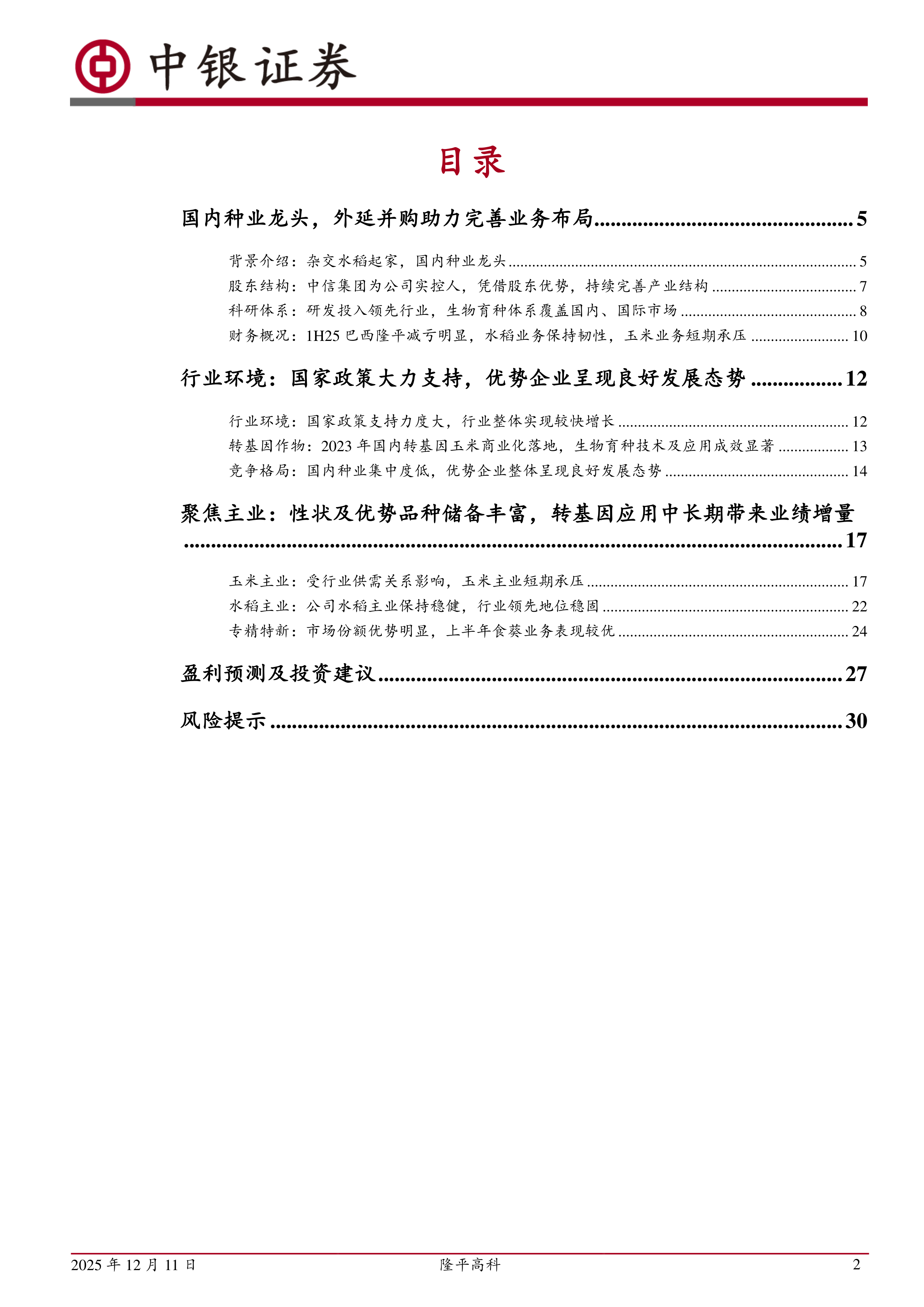公司积极面对行业调整周期,3Q25公司营收逆势增长,归母净利润同比减亏,高质量发展背景下,资产质量持续提升。受制种面积及种子价格增长有限的刚性约束,行业当前处于存量竞争,供给端弹性较小,头部企业通过并购来不断完善业务布局,行业集中度持续提升,龙头企业呈现出强者恒强的特点。隆平高科作为种业龙头,经营业绩彰显韧性,1-3Q25公司营收28.41亿元,同比-1.4%,其中3Q25公司营收6.75亿元,同比+125.7%。3Q25公司收入端实现较大幅度增长主要系公司强化市场研判与优化营销策略,加大市场开拓力度,子公司隆平发展销售收入逆势增长2.89亿元有关。1-3Q25公司归母净利-6.64亿元,同比-39.6%其中3Q25归母净利-5.0亿元,同比+14.8%。若剔除3.4亿元投资收益,1-3Q25公司归母净利同比减亏18.6%。公司利润同比减亏一方面得益于隆平发展毛利率改善(3季报公告隆平发展主营业务毛利率同比+7.39%)使得净利润同比增加;另一方面,上半年公司12亿元定增项目获批,现金流压力得到缓解。在境外基准利率不断加息的情况下,公司通过银团贷款有效降低了整体融资成本,有效控制汇率敞口风险。3Q25公司财务费用率同比-42.3pct,有息负债及资产负债率较年初相比得到改善,资本结构显著优化。在子公司毛利率改善背景下,1-3Q25公司毛利率为32.0%,同比+3.7pct,其中3Q25公司毛利率同比提升20.1pct至18.1%公司通过组织结构优化、降本增效等举措提升运营效率,整体经营持续改善。