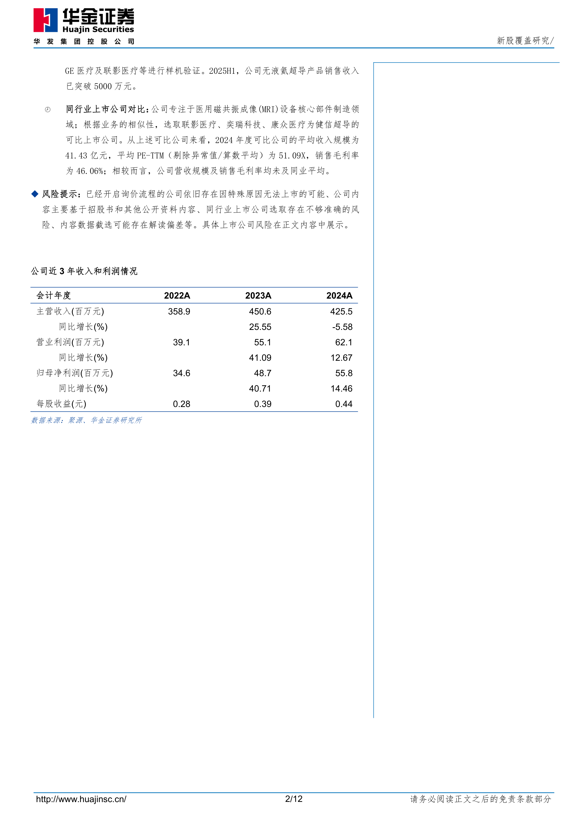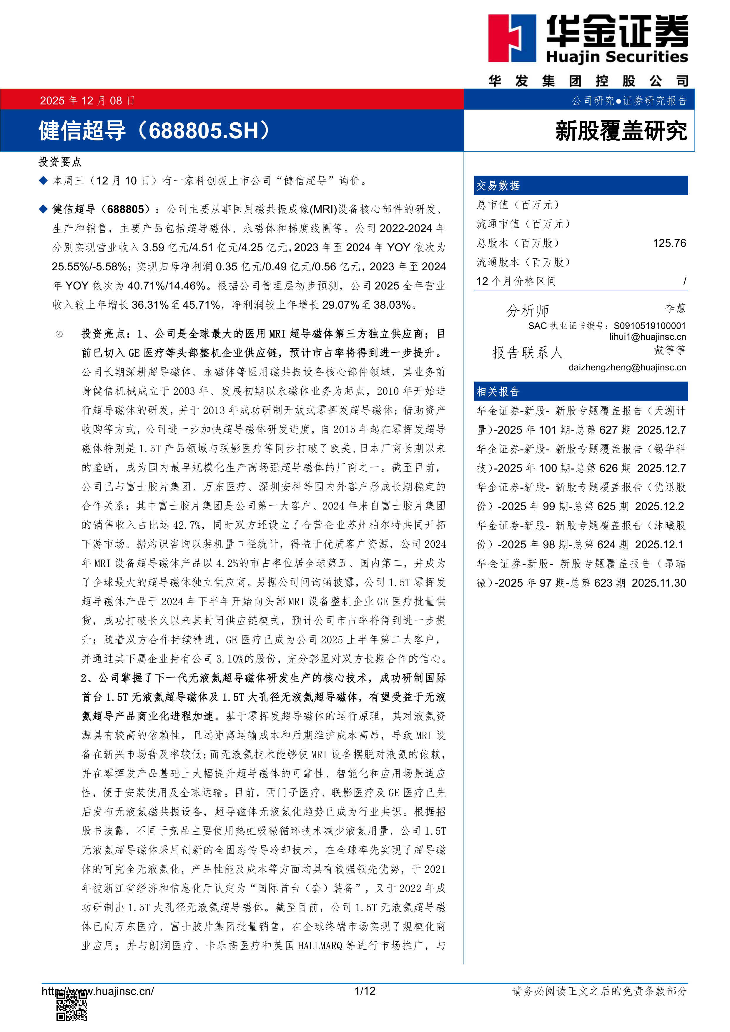 投资亮点:1、公司是全球最大的医用MRI超导磁体第三方独立供应商;目前已切入GE医疗等头部整机企业供应链,预计市占率将得到进一步提升。公司长期深耕超导磁体、永磁体等医用磁共振设备核心部件领域,其业务前身健信机械成立于2003年、发展初期以永磁体业务为起点,2010年开始进行超导磁体的研发,并于2013年成功研制开放式零挥发超导磁体;借助资产收购等方式,公司进一步加快超导磁体研发进度,自2015年起在零挥发超导磁体特别是1.5T产品领域与联影医疗等同步打破了欧美、日本厂商长期以来的垄断,成为国内最早规模化生产高场强超导磁体的厂商之一。截至目前,公司已与富士胶片集团、万东医疗、深圳安科等国内外客户形成长期稳定的合作关系;其中富士胶片集团是公司第一大客户、2024年来自富士胶片集团的销售收入占比达42.7%,同时双方还设立了合营企业苏州柏尔特共同开拓下游市场。据灼识咨询以装机量口径统计,得益于优质客户资源,公司2024年MRI设备超导磁体产品以4.2%的市占率位居全球第五、国内第二,并成为了全球最大的超导磁体独立供应商。另据公司问询函披露,公司1.5T零挥发超导磁体产品于2024年下半年开始向头部MRI设备整机企业GE医疗批量供货,成功打破长久以来其封闭供应链模式,预计公司市占率将得到进一步提升;随着双方合作持续精进,GE医疗已成为公司2025上半年第二大客户,并通过其下属企业持有公司3.10%的股份,充分彰显对双方长期合作的信心。2、公司掌握了下一代无液氦超导磁体研发生产的核心技术,成功研制国际首台1.5T无液氦超导磁体及1.5T大孔径无液氦超导磁体,有望受益于无液氦超导产品商业化进程加速。基于零挥发超导磁体的运行原理,其对液氦资源具有较高的依赖性,且远距离运输成本和后期维护成本高昂,导致MRI设备在新兴市场普及率较低;而无液氦技术能够使MRI设备摆脱对液氦的依赖,并在零挥发产品基础上大幅提升超导磁体的可靠性、智能化和应用场景适应性,便于安装使用及全球运输。目前,西门子医疗、联影医疗及GE医疗已先后发布无液氦磁共振设备,超导磁体无液氦化趋势已成为行业共识。根据招股书披露,不同于竞品主要使用热虹吸微循环技术减少液氦用量,公司1.5T无液氦超导磁体采用创新的全固态传导冷却技术,在全球率先实现了超导磁体的可完全无液氦化,产品性能及成本等方面均具有较强领先优势,于2021年被浙江省经济和信息化厅认定为“国际首台(套)装备”,又于2022年成功研制出1.5T大孔径无液氦超导磁体。截至目前,公司1.5T无液氦超导磁体已向万东医疗、富士胶片集团批量销售,在全球终端市场实现了规模化商业应用;并与朗润医疗、卡乐福医疗和英国HALLMARQ等进行市场推广,与GE医疗及联影医疗等进行样机验证。2025H1,公司无液氦超导产品销售收入已突破5000万元。