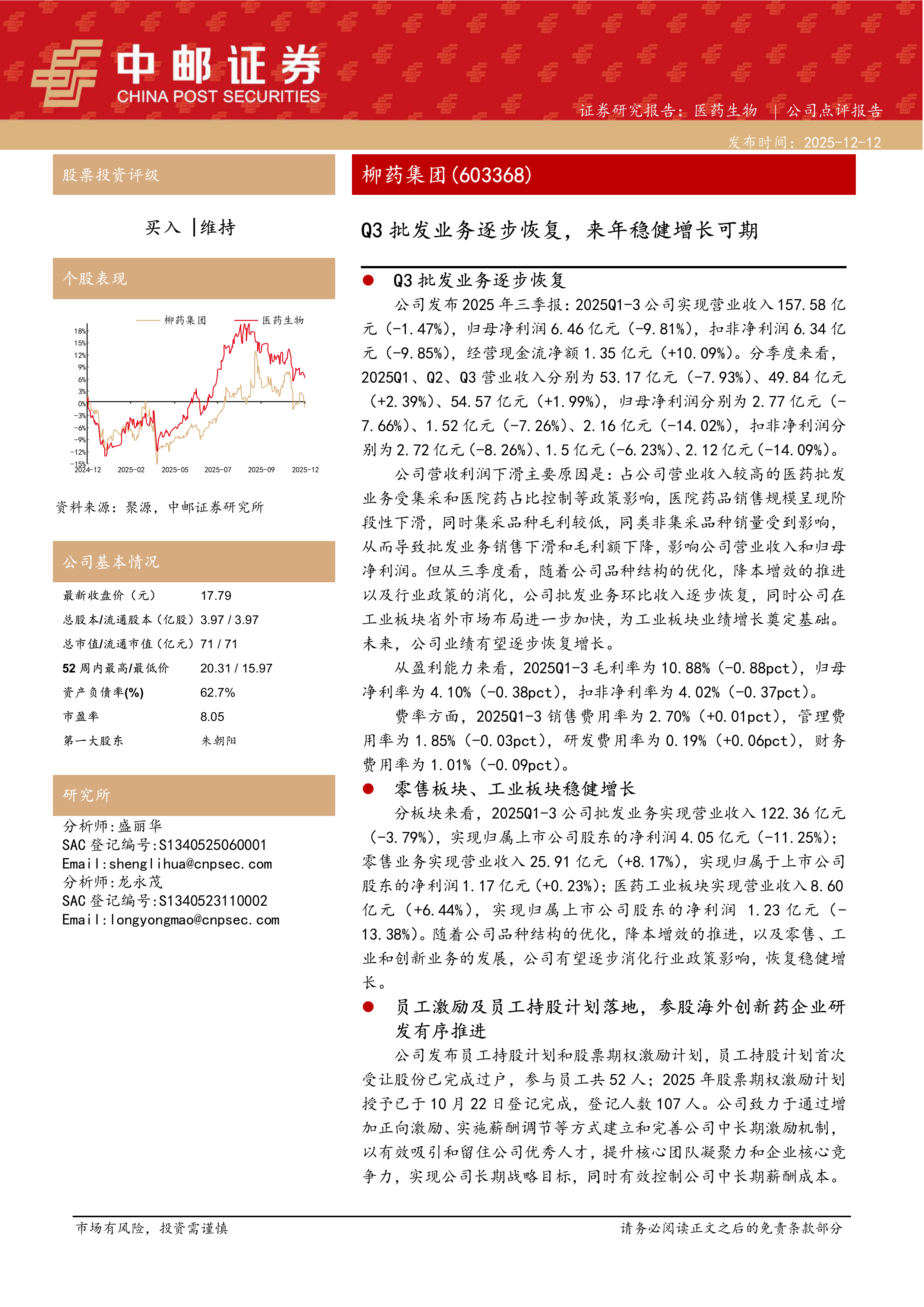 分板块来看,2025Q1-3公司批发业务实现营业收入122.36亿元(-3.79%),实现归属上市公司股东的净利润4.05亿元(-11.25%);零售业务实现营业收入25.91亿元(+8.17%),实现归属于上市公司股东的净利润1.17亿元(+0.23%);医药工业板块实现营业收入8.60亿元(+6.44%),实现归属上市公司股东的净利润1.23亿元(-13.38%)。随着公司品种结构的优化,降本增效的推进,以及零售、工业和创新业务的发展,公司有望逐步消化行业政策影响,恢复稳健增长。
