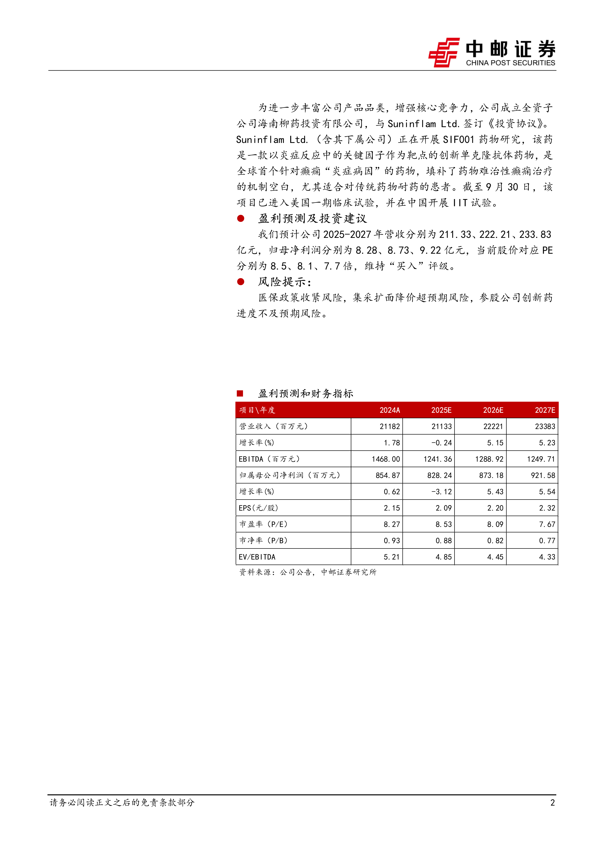 为进一步丰富公司产品品类,增强核心竞争力,公司成立全资子公司海南柳药投资有限公司,与Suninflam Ltd.签订《投资协议》。Suninflam Ltd.(含其下属公司)正在开展SIF001药物研究,该药是一款以炎症反应中的关键因子作为靶点的创新单克隆抗体药物,是全球首个针对癫痫“炎症病因”的药物,填补了药物难治性癫痫治疗的机制空白,尤其适合对传统药物耐药的患者。截至9月30日,该项目已进入美国一期临床试验,并在中国开展IIT试验。