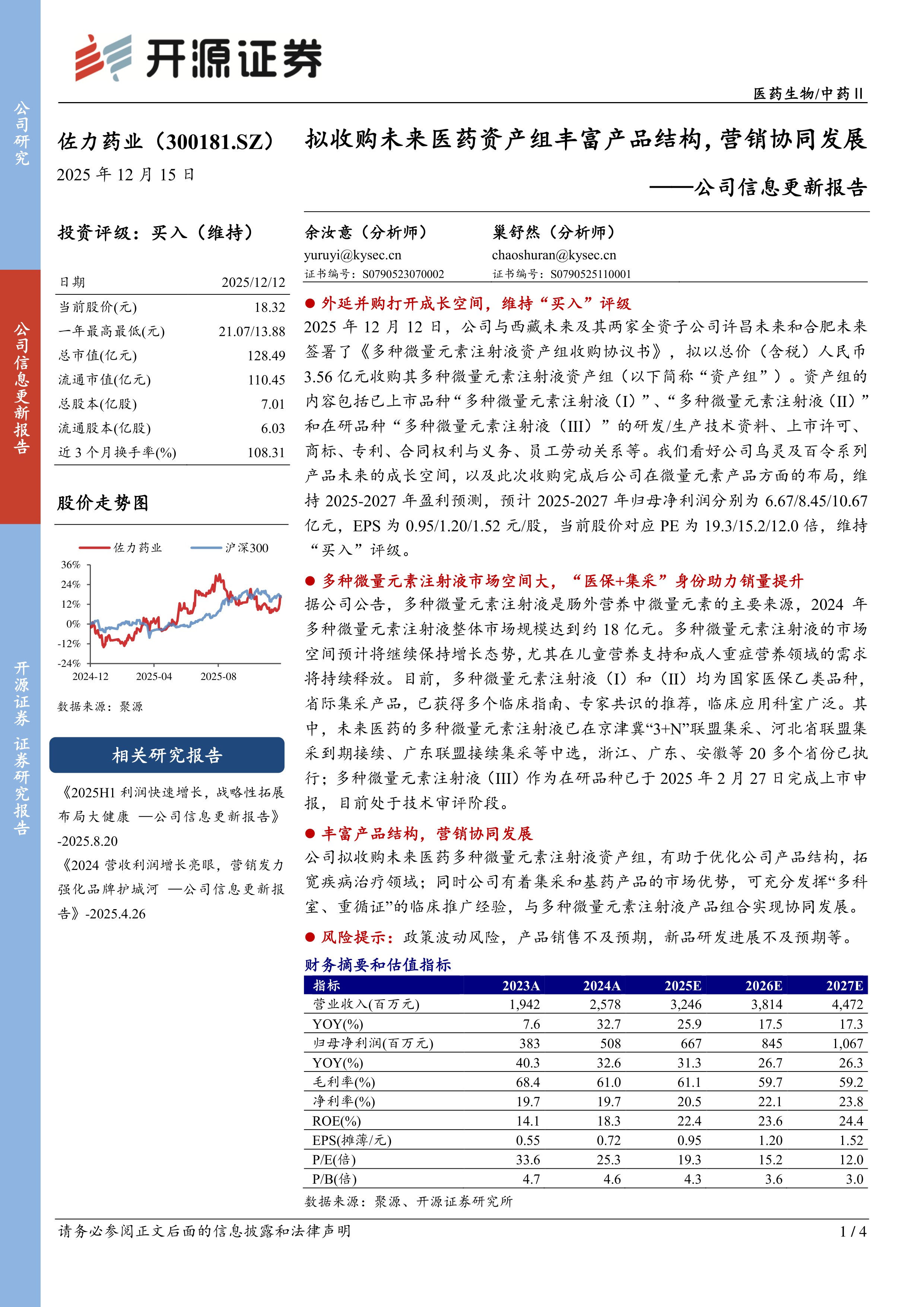 2025年12月12日,公司与西藏未来及其两家全资子公司许昌未来和合肥未来签署了《多种微量元素注射液资产组收购协议书》,拟以总价(含税)人民币3.56亿元收购其多种微量元素注射液资产组(以下简称“资产组”)。资产组的内容包括已上市品种“多种微量元素注射液(I)”、“多种微量元素注射液(II)”和在研品种“多种微量元素注射液(III)”的研发/生产技术资料、上市许可、商标、专利、合同权利与义务、员工劳动关系等。我们看好公司乌灵及百令系列产品未来的成长空间,以及此次收购完成后公司在微量元素产品方面的布局,维持2025-2027年盈利预测,预计2025-2027年归母净利润分别为6.67/8.45/10.67亿元,EPS为0.95/1.20/1.52元/股,当前股价对应PE为19.3/15.2/12.0倍,维持“买入”评级。
