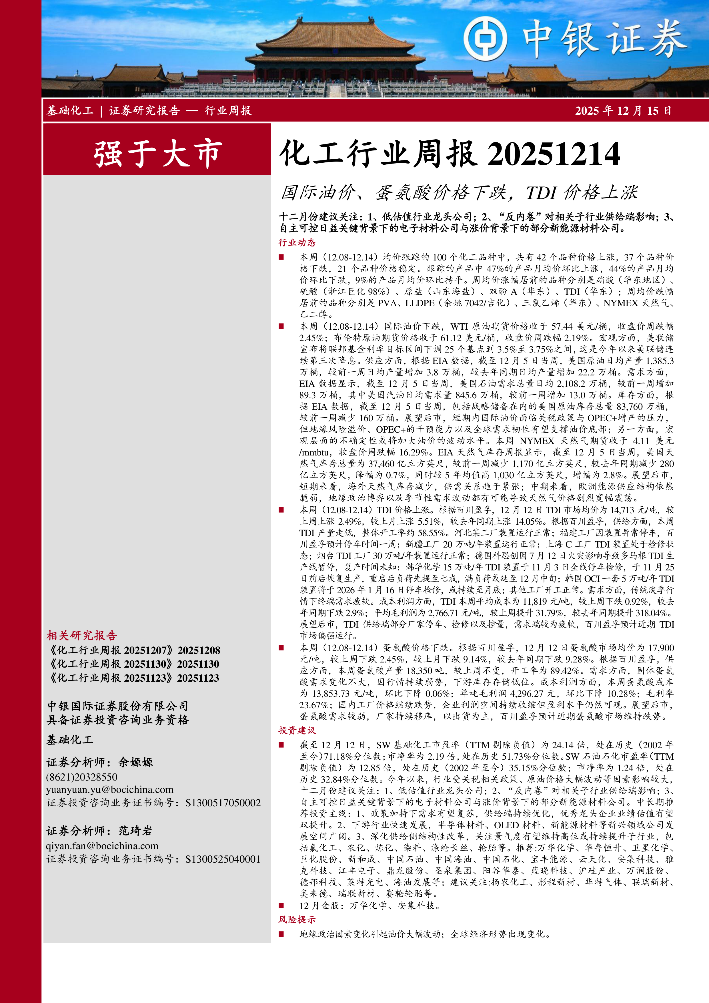 截至12月12日,SW基础化工市盈率(TTM剔除负值)为24.14倍,处在历史(2002年至今)71.18%分位数;市净率为2.19倍,处在历史51.73%分位数。SW石油石化市盈率(TTM剔除负值)为12.85倍,处在历史(2002年至今)35.15%分位数;市净率为1.24倍,处在历史32.84%分位数。今年以来,行业受关税相关政策、原油价格大幅波动等因素影响较大十二月份建议关注:1、低估值行业龙头公司;2、“反内卷”对相关子行业供给端影响;3自主可控日益关键背景下的电子材料公司与涨价背景下的部分新能源材料公司。中长期推荐投资主线:1、政策加持下需求有望复苏,供给端持续优化,优秀龙头企业业绩估值有望双提升。2、下游行业快速发展,半导体材料、OLED材料、新能源材料等新兴领域公司发展空间广阔。3、深化供给侧结构性改革,关注景气度有望维持高位或持续提升子行业,包括氟化工、农化、炼化、染料、涤纶长丝、轮胎等。推荐:万华化学、华鲁恒升、卫星化学巨化股份、新和成、中国石油、中国海油、中国石化、宝丰能源、云天化、安集科技、雅克科技、江丰电子、鼎龙股份、圣泉集团、阳谷华泰、蓝晓科技、沪硅产业、万润股份、德邦科技、莱特光电、海油发展等;建议关注:扬农化工、彤程新材、华特气体、联瑞新材奥来德、瑞联新材、赛轮轮胎等。