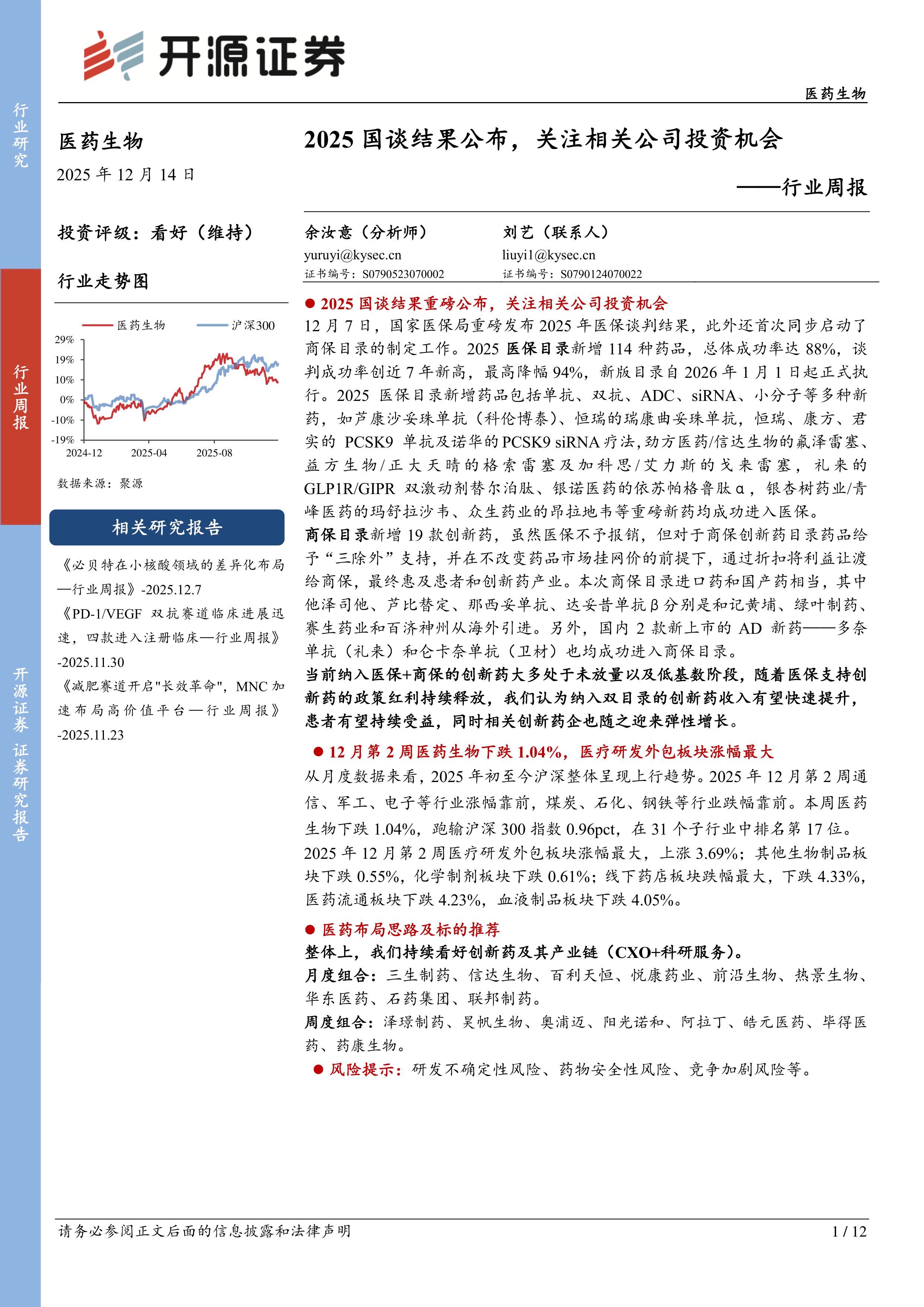 12月7日,国家医保局重磅发布2025年医保谈判结果,此外还首次同步启动了商保目录的制定工作。2025医保目录新增114种药品,总体成功率达88%,谈判成功率创近7年新高,最高降幅94%,新版目录自2026年1月1日起正式执行。2025医保目录新增药品包括单抗、双抗、ADC、siRNA、小分子等多种新药,如芦康沙妥珠单抗(科伦博泰)、恒瑞的瑞康曲妥珠单抗,恒瑞、康方、君实的PCSK9单抗及诺华的PCSK9siRNA疗法,劲方医药/信达生物的氟泽雷塞、益方生物/正大天晴的格索雷塞及加科思/艾力斯的戈来雷塞,礼来的GLP1R/GIPR双激动剂替尔泊肽、银诺医药的依苏帕格鲁肽α,银杏树药业/青峰医药的玛舒拉沙韦、众生药业的昂拉地韦等重磅新药均成功进入医保。