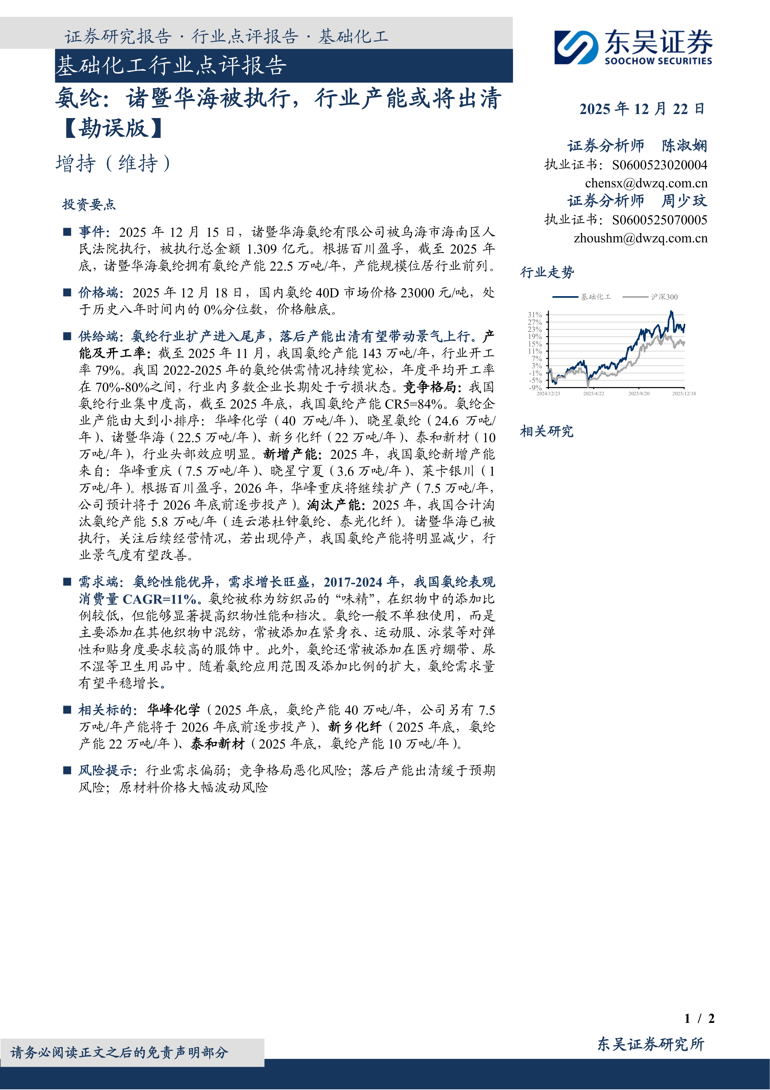 基础化工行业点评报告:氨纶:诸暨华海被执行,行业产能或将出清【勘误版】