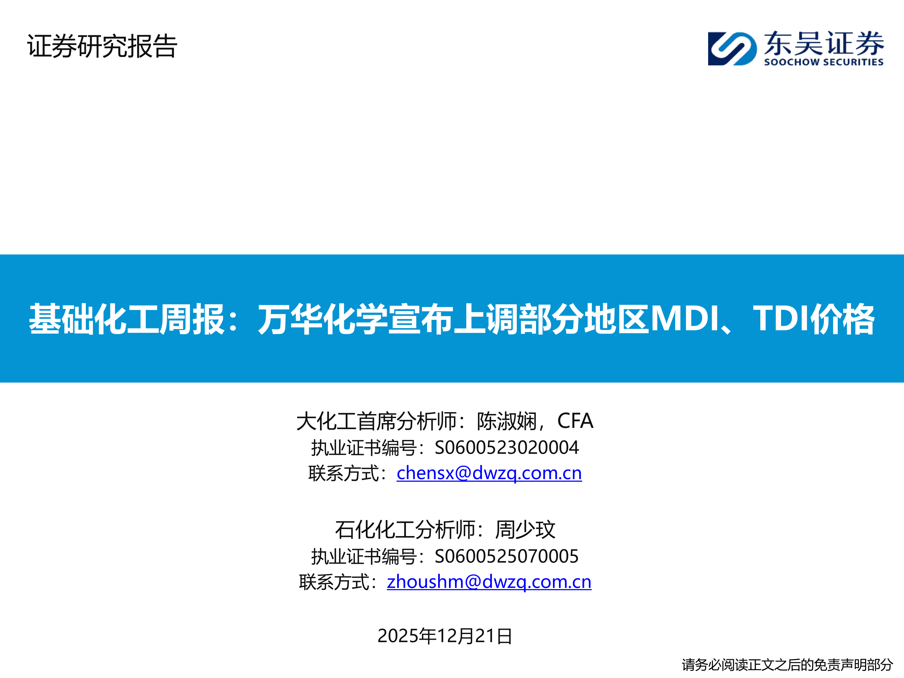 基础化工周报:万华化学宣布上调部分地区MDI、TDI价格