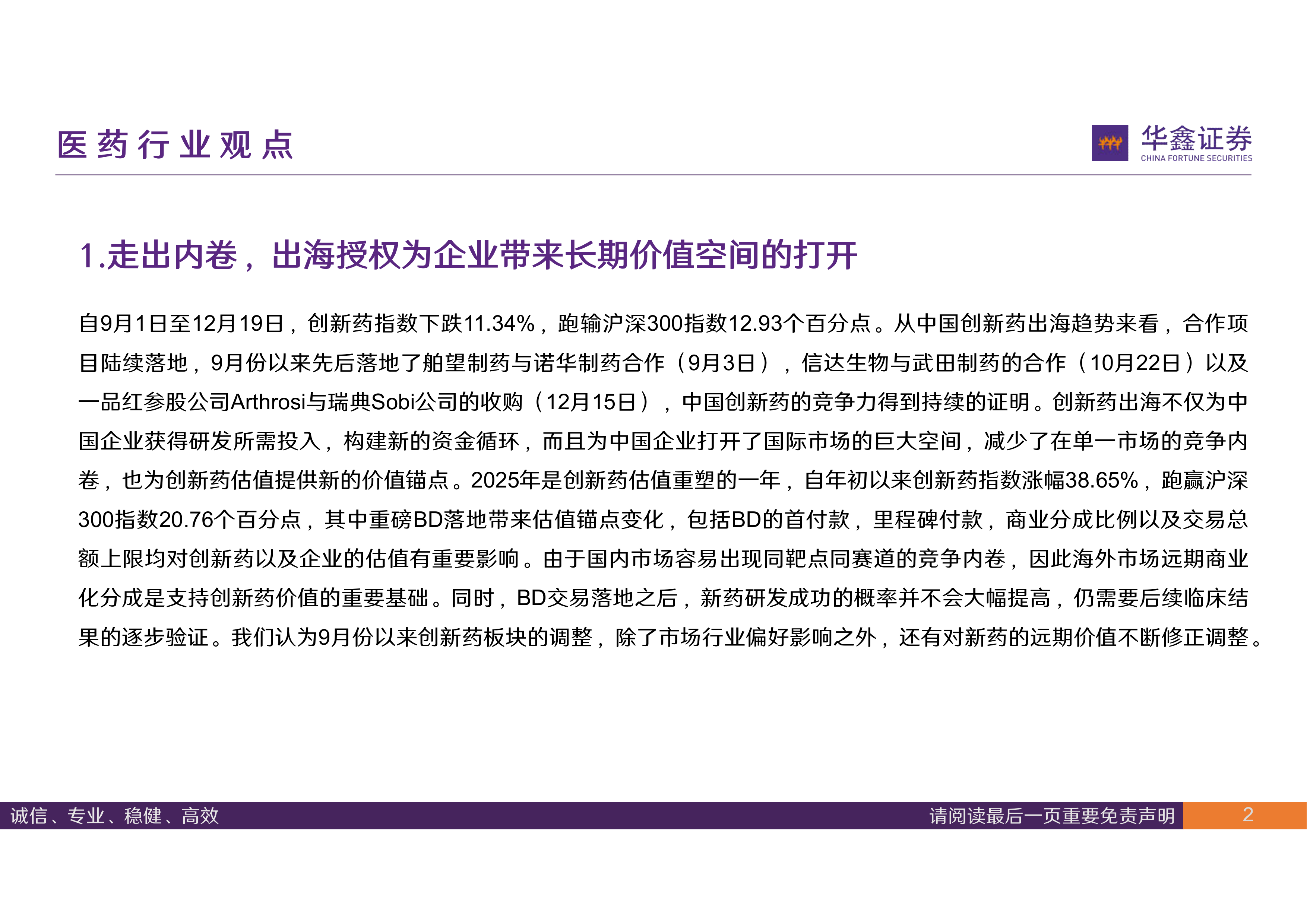 自9月1日至12月19日,创新药指数下跌11.34%,跑输沪深300指数12.93个百分点。从中国创新药出海趋势来看,合作项目陆续落地,9月份以来先后落地了舶望制药与诺华制药合作(9月3日),信达生物与武田制药的合作(10月22日)以及一品红参股公司Arthrosi与瑞典Sobi公司的收购(12月15日),中国创新药的竞争力得到持续的证明。创新药出海不仅为中国企业获得研发所需投入,构建新的资金循环,而且为中国企业打开了国际市场的巨大空间,减少了在单一市场的竞争内卷,也为创新药估值提供新的价值锚点。2025年是创新药估值重塑的一年,自年初以来创新药指数涨幅38.65%,跑赢沪深300指数20.76个百分点,其中重磅BD落地带来估值锚点变化,包括BD的首付款,里程碑付款,商业分成比例以及交易总额上限均对创新药以及企业的估值有重要影响。由于国内市场容易出现同靶点同赛道的竞争内卷,因此海外市场远期商业化分成是支持创新药价值的重要基础。同时,BD交易落地之后,新药研发成功的概率并不会大幅提高,仍需要后续临床结果的逐步验证。我们认为9月份以来创新药板块的调整,除了市场行业偏好影响之外,还有对新药的远期价值不断修正调整。