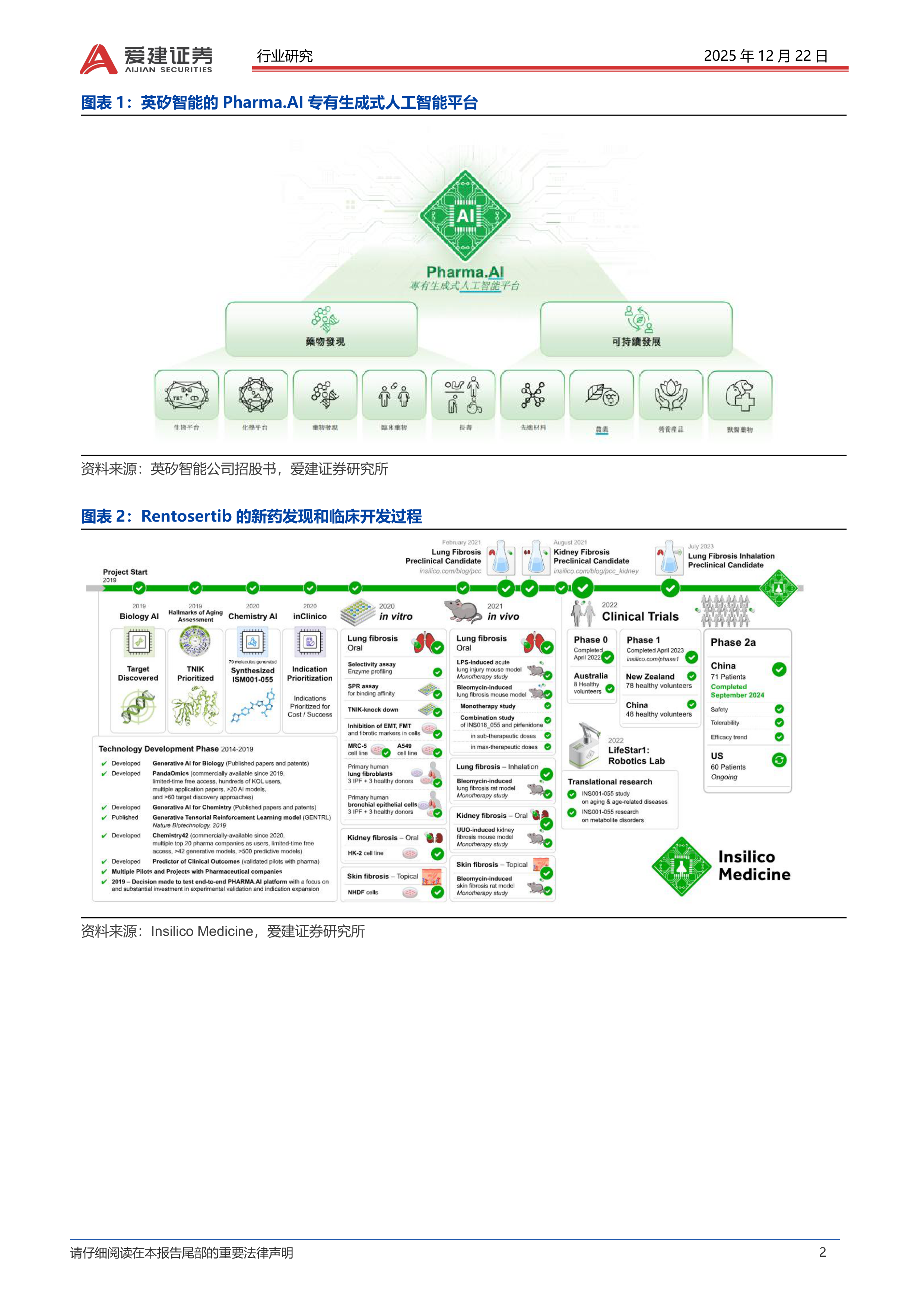 英矽智能IPO发行在即,看好AI驱动创新药研发平台。12月18日,英矽智能(03696.HK)宣布正式启动新股发售工作,发售价为每股24.05港元,对应总市值134.06亿港元,预计于12月30日在港交所主板上市,募资总额达到22.77亿港元,主要用于在研管线的临床研究。英矽智能是一家AI驱动的Biotech公司,已透过自主开发的生成式人工智能平台Pharma.AI产生20多项研发管线,其中核心产品Rentosertib(ISM001-055)是一款FIC的TNIK小分子抑制剂,中国2a期临床研究结果积极,计划于2026年上半年启动2b/3期临床研究。Rentosertib的首发适应症为特发性肺纤维化IPF,目前已获得美国FDA的孤儿药资格认定和中国NMPA的突破性疗法认定。根据沙利文的估算,2030年全球IPF药物市场规模将达到75亿美元,Rentosertib具有成为重磅品种的潜力。