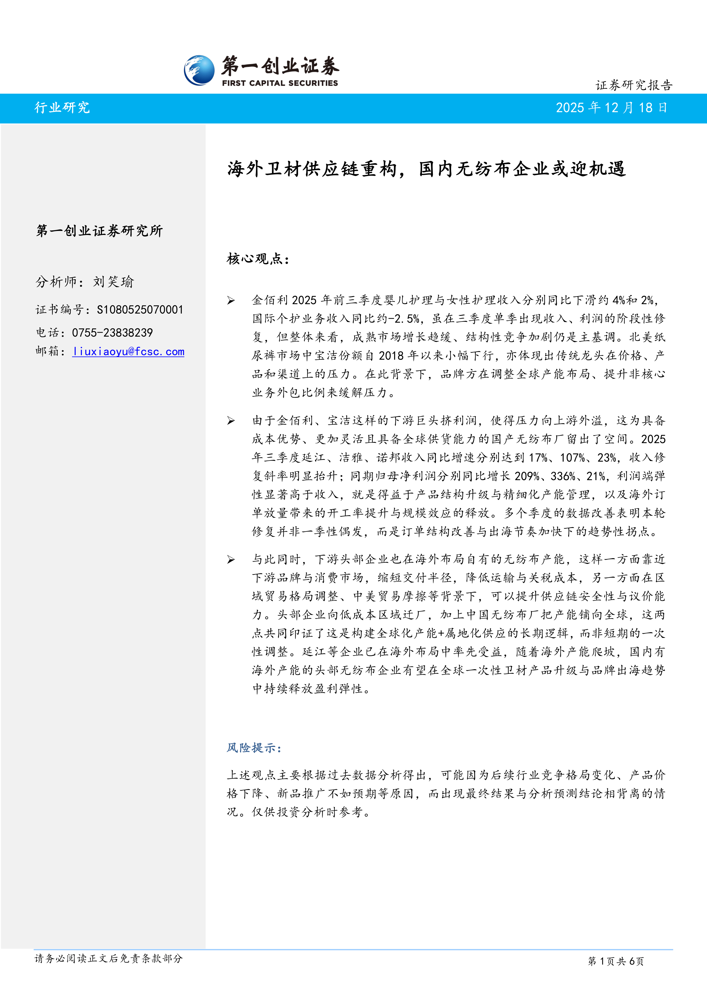 由于金佰利、宝洁这样的下游巨头挤利润,使得压力向上游外溢,这为具备成本优势、更加灵活且具备全球供货能力的国产无纺布厂留出了空间。2025年三季度延江、洁雅、诺邦收入同比增速分别达到17%、107%、23%,收入修复斜率明显抬升;同期归母净利润分别同比增长209%、336%、21%,利润端弹性显著高于收入,就是得益于产品结构升级与精细化产能管理,以及海外订单放量带来的开工率提升与规模效应的释放。多个季度的数据改善表明本轮修复并非一季性偶发,而是订单结构改善与出海节奏加快下的趋势性拐点。