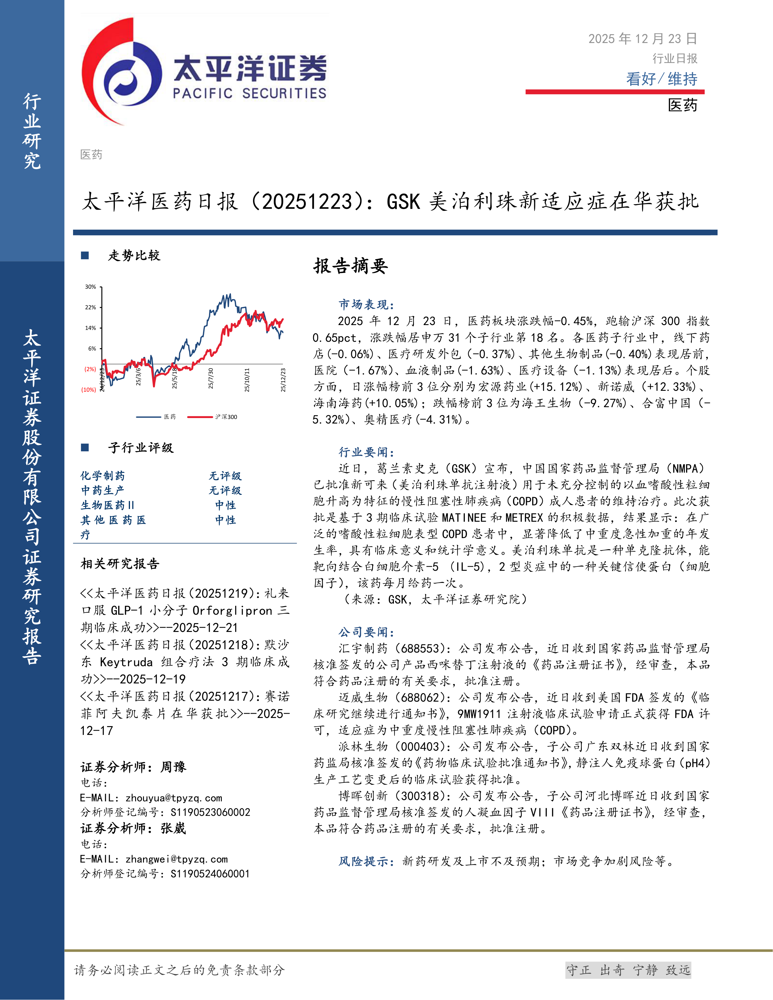 2025年12月23日,医药板块涨跌幅-0.45%,跑输沪深300指数0.65pct,涨跌幅居申万31个子行业第18名。各医药子行业中,线下药店(-0.06%)、医疗研发外包(-0.37%)、其他生物制品(-0.40%)表现居前,医院(-1.67%)、血液制品(-1.63%)、医疗设备(-1.13%)表现居后。个股方面,日涨幅榜前3位分别为宏源药业(+15.12%)、新诺威(+12.33%)、海南海药(+10.05%);跌幅榜前3位为海王生物(-9.27%)、合富中国(-5.32%)、奥精医疗(-4.31%)。