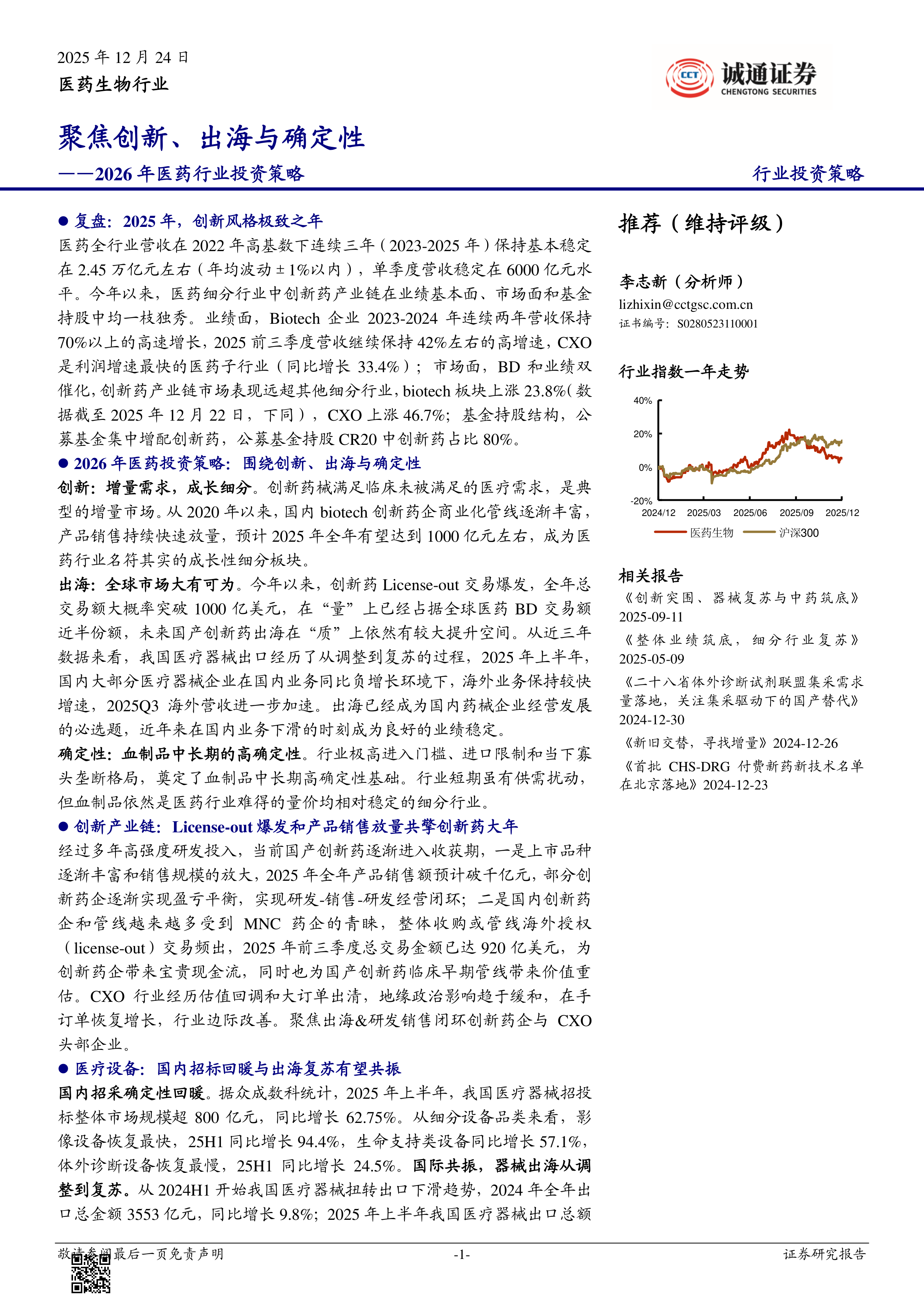 2026年医药行业投资策略:聚焦创新、出海与确定性