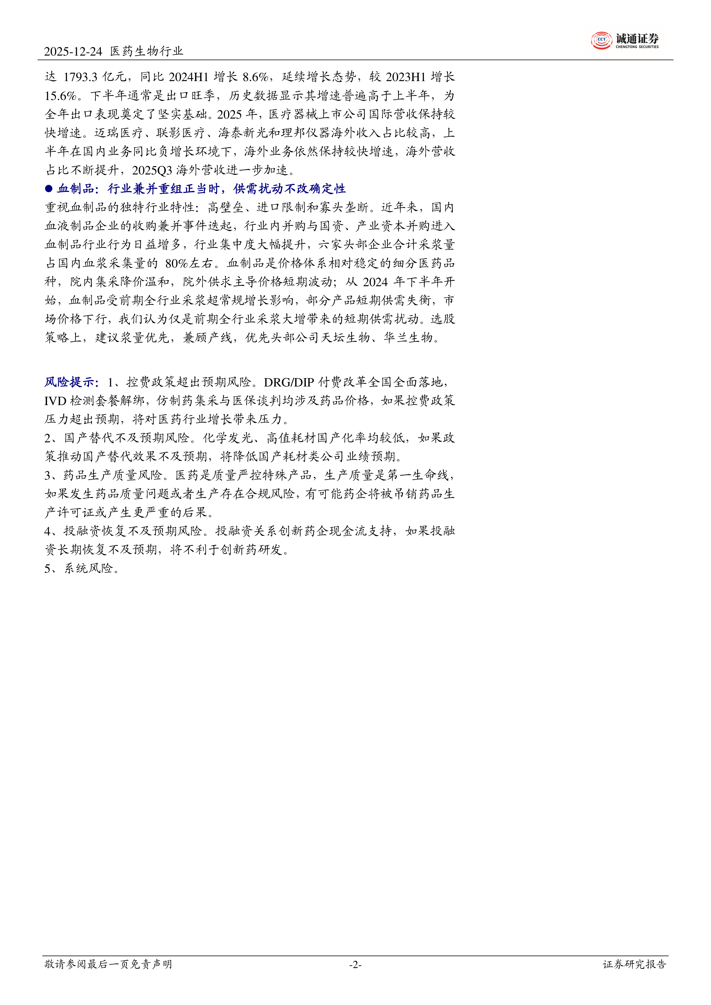 重视血制品的独特行业特性:高壁垒、进口限制和寡头垄断。近年来,国内血液制品企业的收购兼并事件迭起,行业内并购与国资、产业资本并购进入血制品行业行为日益增多,行业集中度大幅提升,六家头部企业合计采浆量占国内血浆采集量的80%左右。血制品是价格体系相对稳定的细分医药品种,院内集采降价温和,院外供求主导价格短期波动;从2024年下半年开始,血制品受前期全行业采浆超常规增长影响,部分产品短期供需失衡,市场价格下行,我们认为仅是前期全行业采浆大增带来的短期供需扰动。选股策略上,建议浆量优先,兼顾产线,优先头部公司天坛生物、华兰生物。