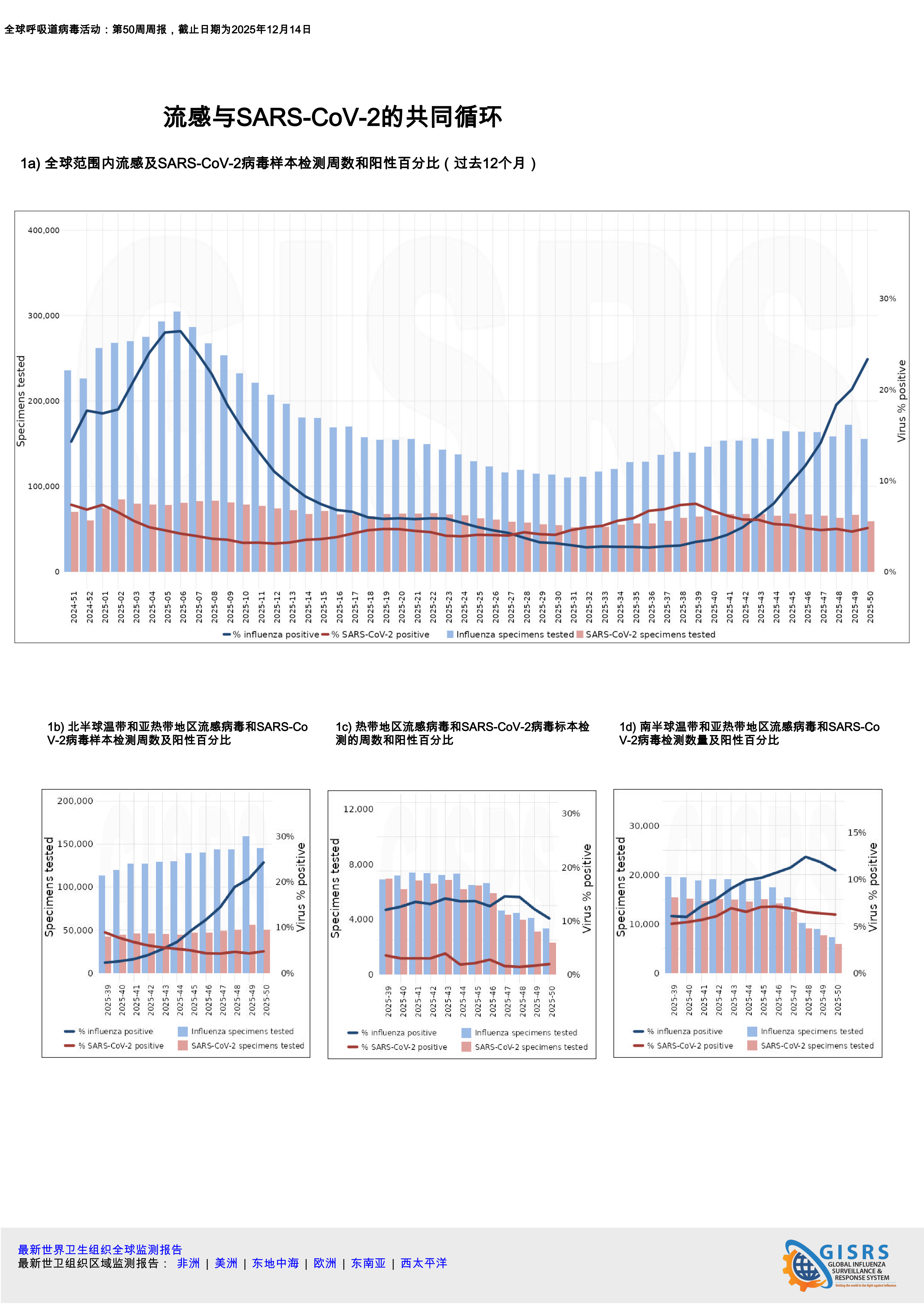 在全球范围内,流感活动水平升高,阳性率约为25%,并在第50周持续上升。SARS-CoV-2活动保持稳定和较低水平。流感主导,在北半球温带和亚热带地区阳性率超过20%,在南半球温带、亚热带和热带地区为10%。
