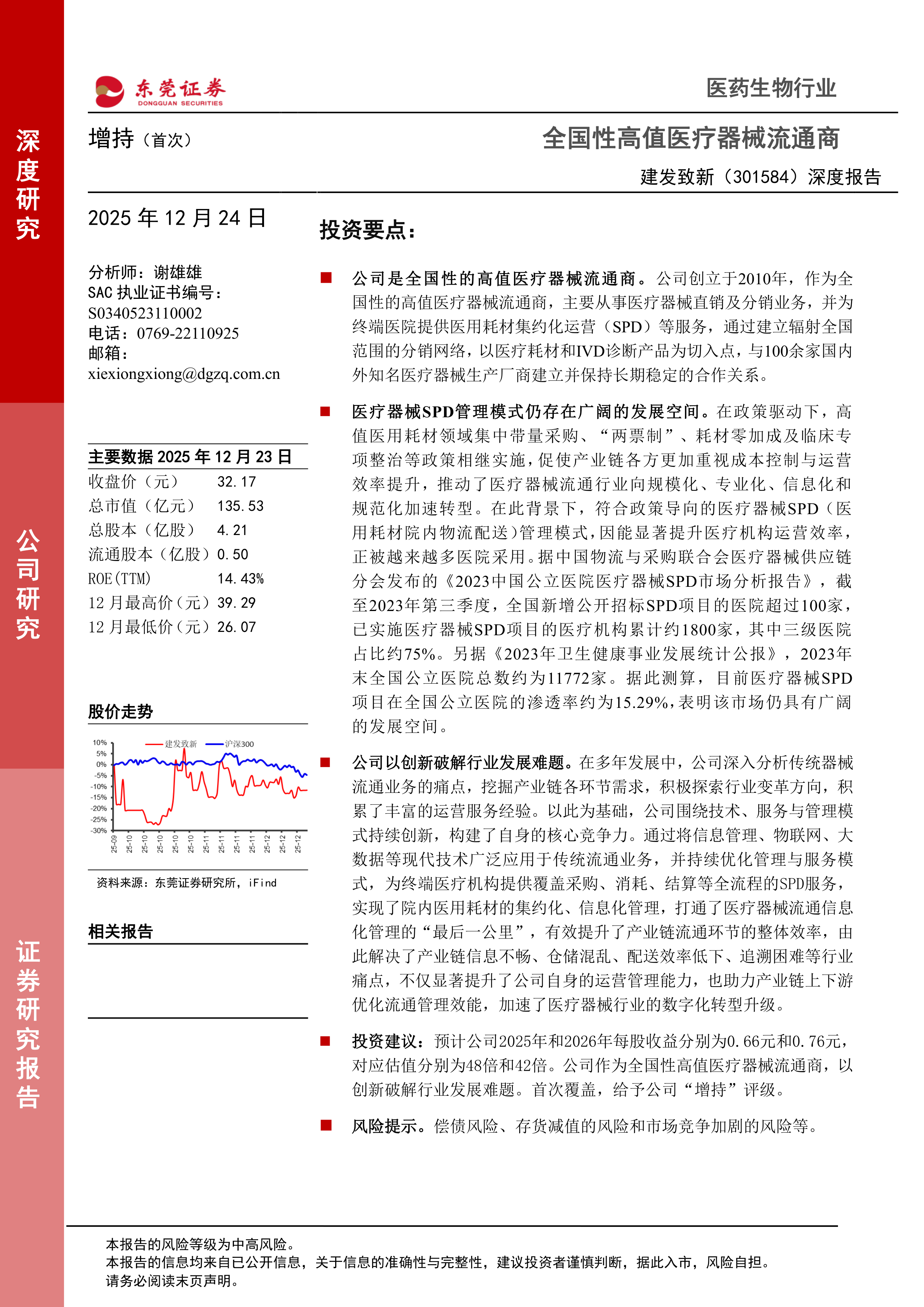 投资建议:预计公司2025年和2026年每股收益分别为0.66元和0.76元,对应估值分别为48倍和42倍。公司作为全国性高值医疗器械流通商,以创新破解行业发展难题。首次覆盖,给予公司“增持”评级。