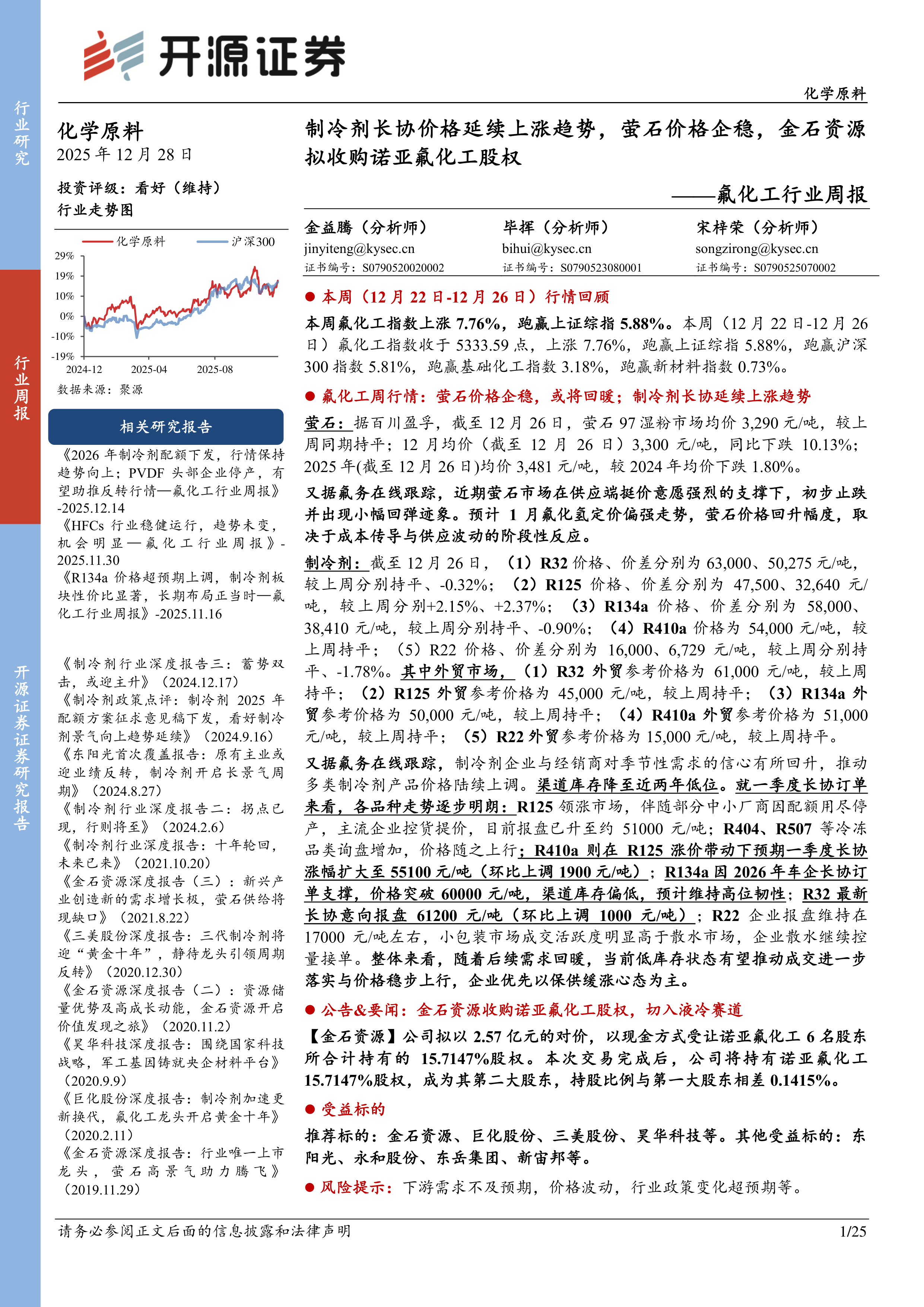 氟化工行业周报:制冷剂长协价格延续上涨趋势,萤石价格企稳,金石资源拟收购诺亚氟化工股权