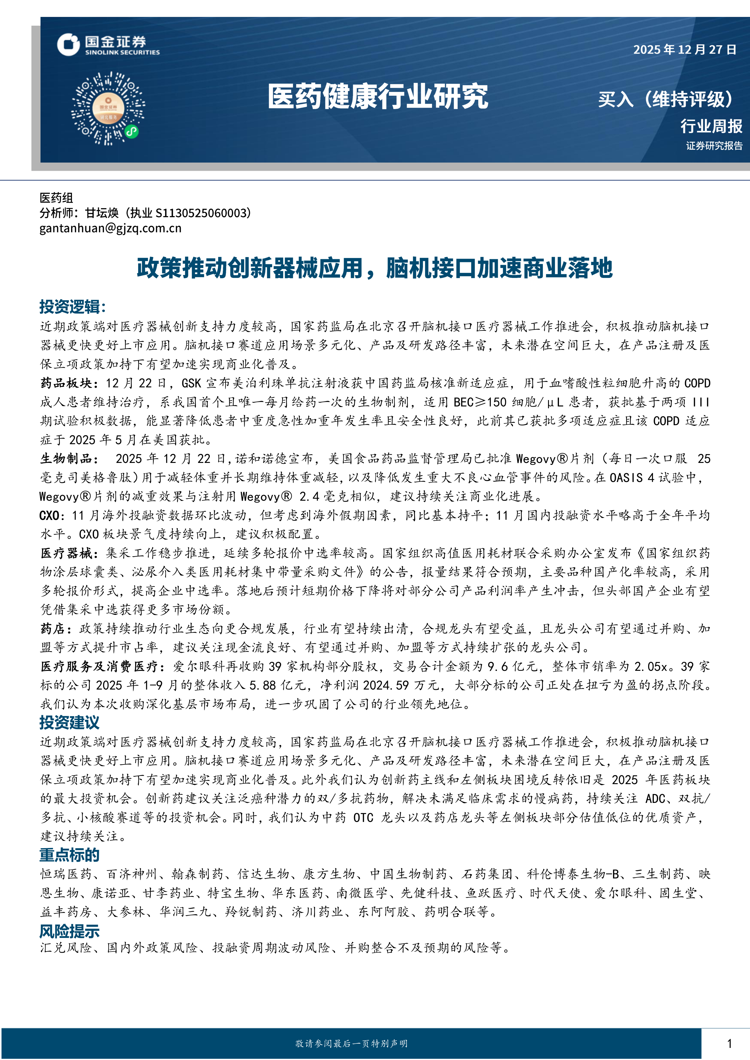 医药健康行业研究:政策推动创新器械应用,脑机接口加速商业落地