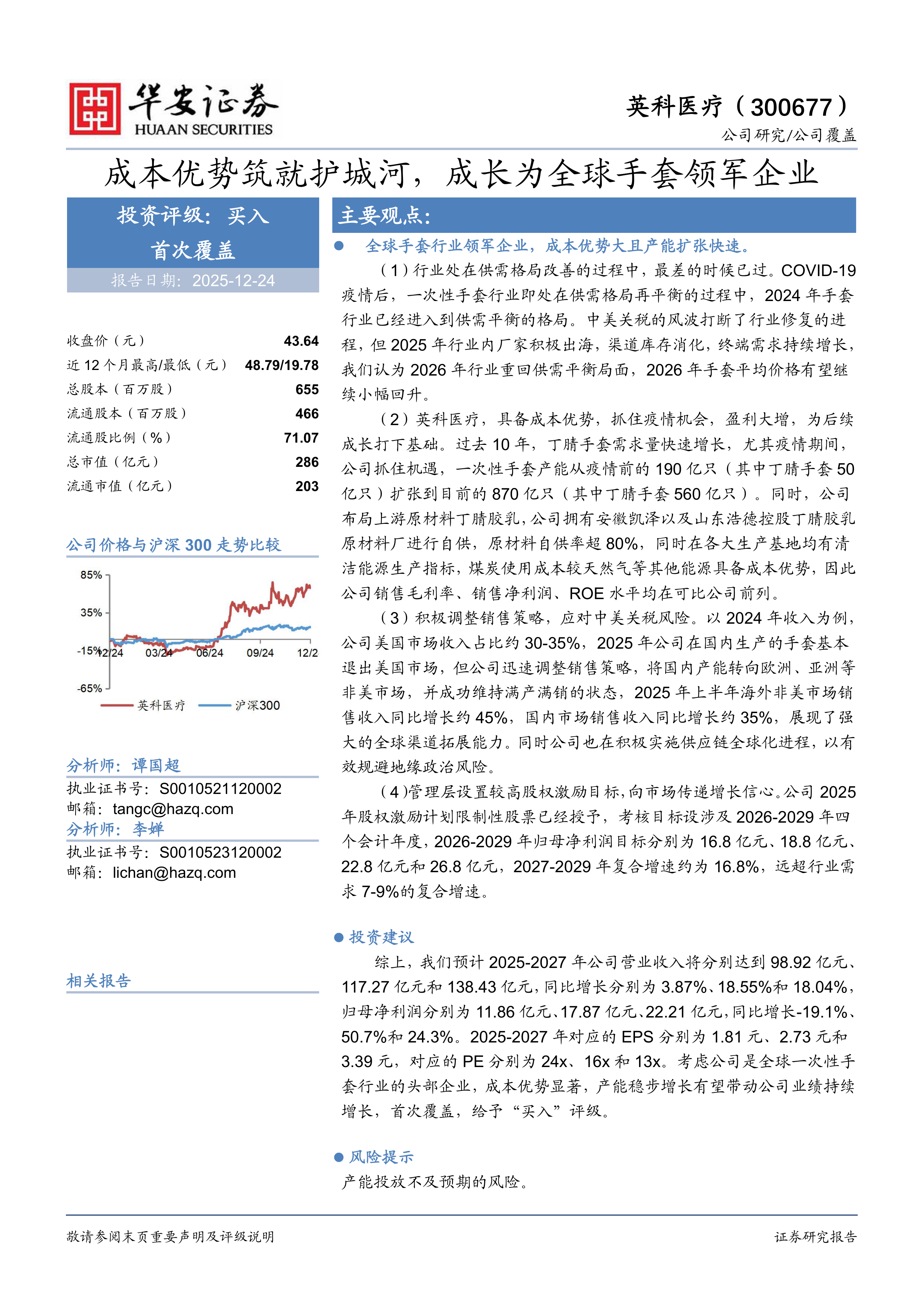 综上,我们预计2025-2027年公司营业收入将分别达到98.92亿元、117.27亿元和138.43亿元,同比增长分别为3.87%、18.55%和18.04%,归母净利润分别为11.86亿元、17.87亿元、22.21亿元,同比增长-19.1%、50.7%和24.3%。2025-2027年对应的EPS分别为1.81元、2.73元和3.39元,对应的PE分别为24x、16x和13x。考虑公司是全球一次性手套行业的头部企业,成本优势显著,产能稳步增长有望带动公司业绩持续增长,首次覆盖,给予“买入”评级。