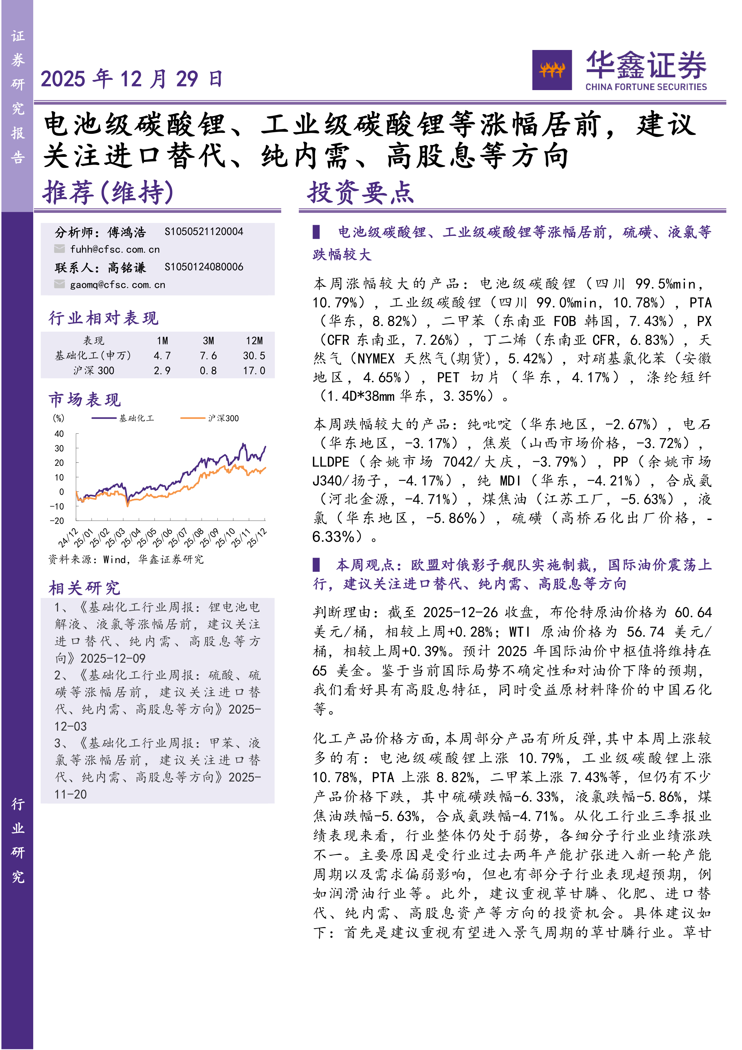 基础化工行业研究:电池级碳酸锂、工业级碳酸锂等涨幅居前,建议关注进口替代、纯内需、高股息等方向