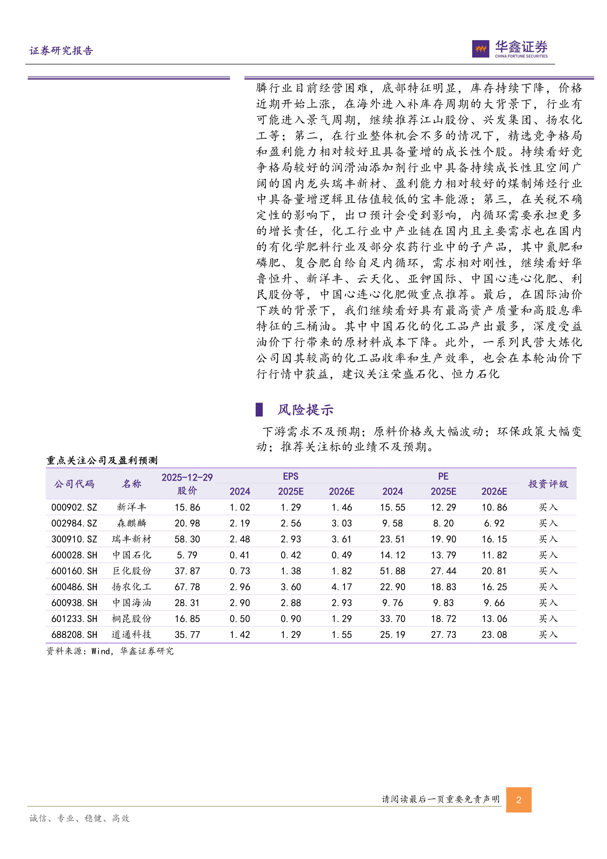 化工产品价格方面,本周部分产品有所反弹,其中本周上涨较多的有:电池级碳酸锂上涨10.79%,工业级碳酸锂上涨10.78%,PTA上涨8.82%,二甲苯上涨7.43%等,但仍有不少产品价格下跌,其中硫磺跌幅-6.33%,液氯跌幅-5.86%,煤焦油跌幅-5.63%,合成氨跌幅-4.71%。从化工行业三季报业绩表现来看,行业整体仍处于弱势,各细分子行业业绩涨跌不一。主要原因是受行业过去两年产能扩张进入新一轮产能周期以及需求偏弱影响,但也有部分子行业表现超预期,例如润滑油行业等。此外,建议重视草甘膦、化肥、进口替代、纯内需、高股息资产等方向的投资机会。具体建议如下:首先是建议重视有望进入景气周期的草甘膦行业。草甘膦行业目前经营困难,底部特征明显,库存持续下降,价格近期开始上涨,在海外进入补库存周期的大背景下,行业有可能进入景气周期,继续推荐江山股份、兴发集团、扬农化工等;第二,在行业整体机会不多的情况下,精选竞争格局和盈利能力相对较好且具备量增的成长性个股。持续看好竞争格局较好的润滑油添加剂行业中具备持续成长性且空间广阔的国内龙头瑞丰新材、盈利能力相对较好的煤制烯烃行业中具备量增逻辑且估值较低的宝丰能源;第三,在关税不确定性的影响下,出口预计会受到影响,内循环需要承担更多的增长责任,化工行业中产业链在国内且主要需求也在国内的有化学肥料行业及部分农药行业中的子产品,其中氮肥和磷肥、复合肥自给自足内循环,需求相对刚性,继续看好华鲁恒升、新洋丰、云天化、亚钾国际、中国心连心化肥、利民股份等,中国心连心化肥做重点推荐。最后,在国际油价下跌的背景下,我们继续看好具有最高资产质量和高股息率特征的三桶油。其中中国石化的化工品产出最多,深度受益油价下行带来的原材料成本下降。此外,一系列民营大炼化公司因其较高的化工品收率和生产效率,也会在本轮油价下行行情中获益,建议关注荣盛石化、恒力石化