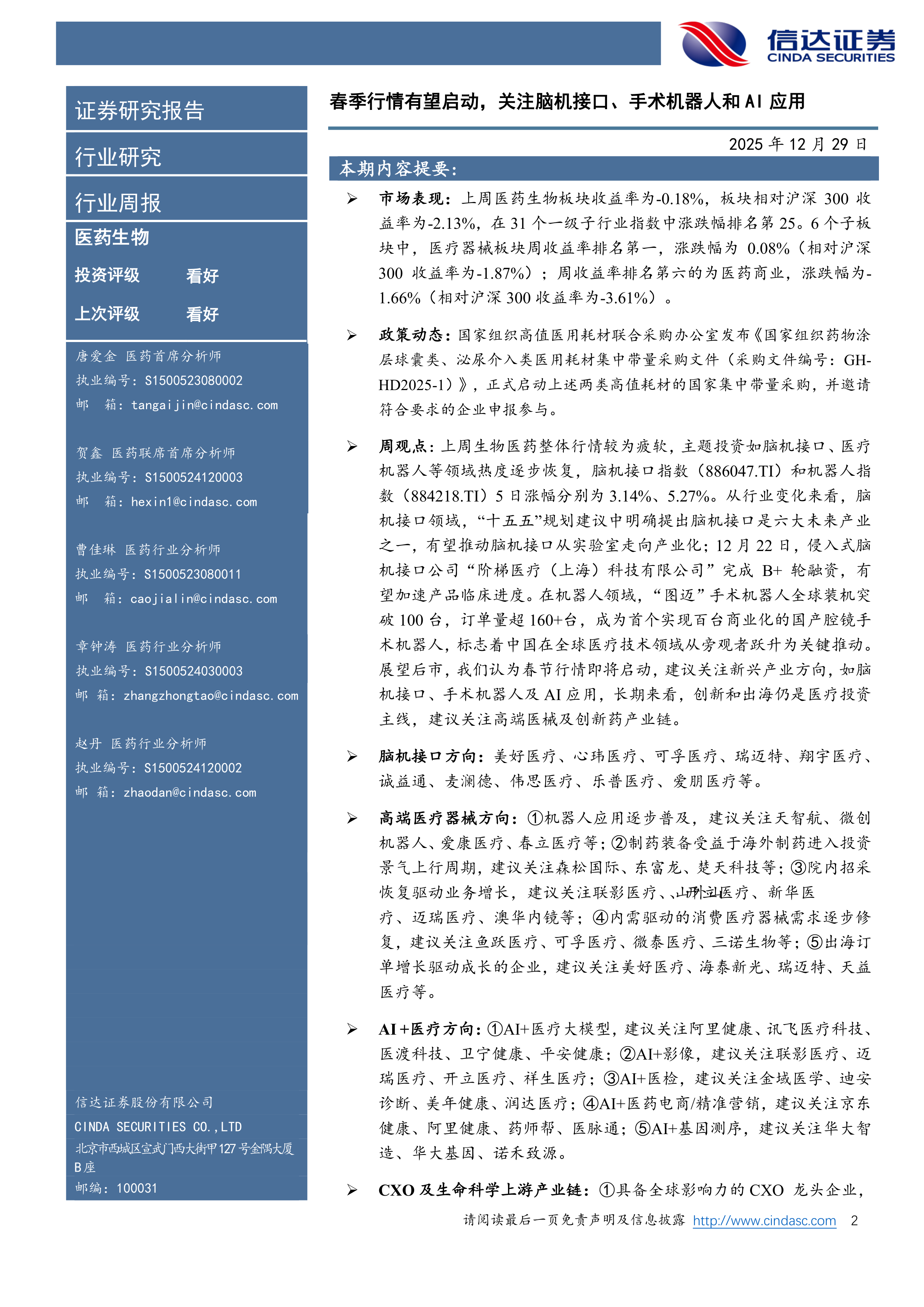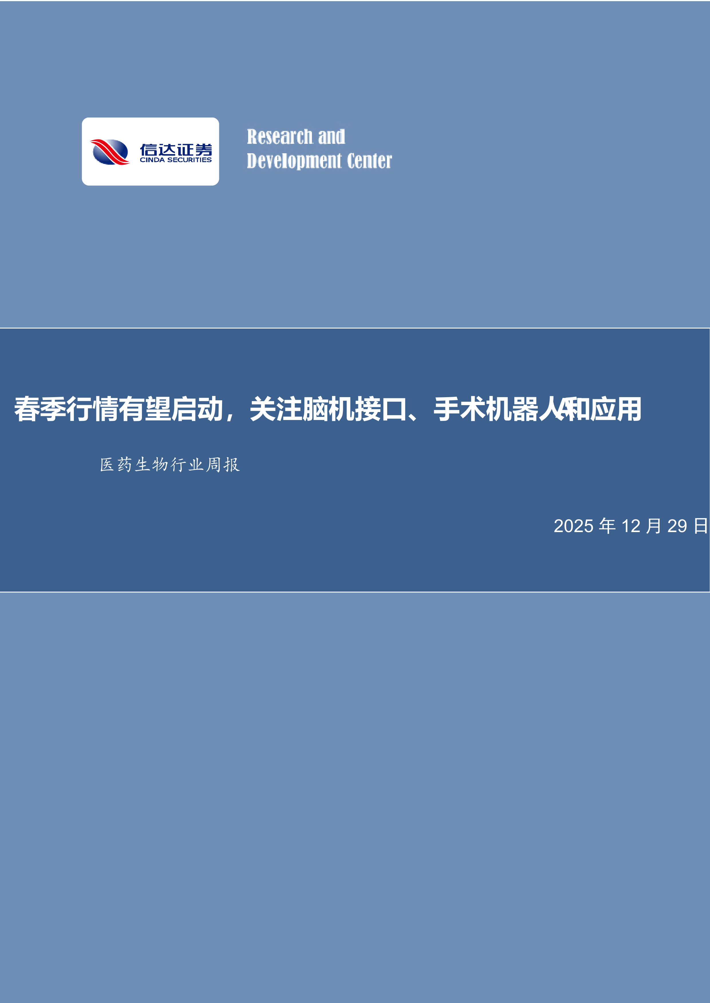 周观点:上周生物医药整体行情较为疲软,主题投资如脑机接口、医疗机器人等领域热度逐步恢复,脑机接口指数(886047.TI)和机器人指数(884218.TI)5日涨幅分别为3.14%、5.27%。从行业变化来看,脑机接口领域,“十五五”规划建议中明确提出脑机接口是六大未来产业之一,有望推动脑机接口从实验室走向产业化;12月22日,侵入式脑机接口公司“阶梯医疗(上海)科技有限公司”完成B+轮融资,有望加速产品临床进度。在机器人领域,“图迈”手术机器人全球装机突破100台,订单量超160+台,成为首个实现百台商业化的国产腔镜手术机器人,标志着中国在全球医疗技术领域从旁观者跃升为关键推动。展望后市,我们认为春节行情即将启动,建议关注新兴产业方向,如脑机接口、手术机器人及AI应用,长期来看,创新和出海仍是医疗投资主线,建议关注高端医械及创新药产业链。