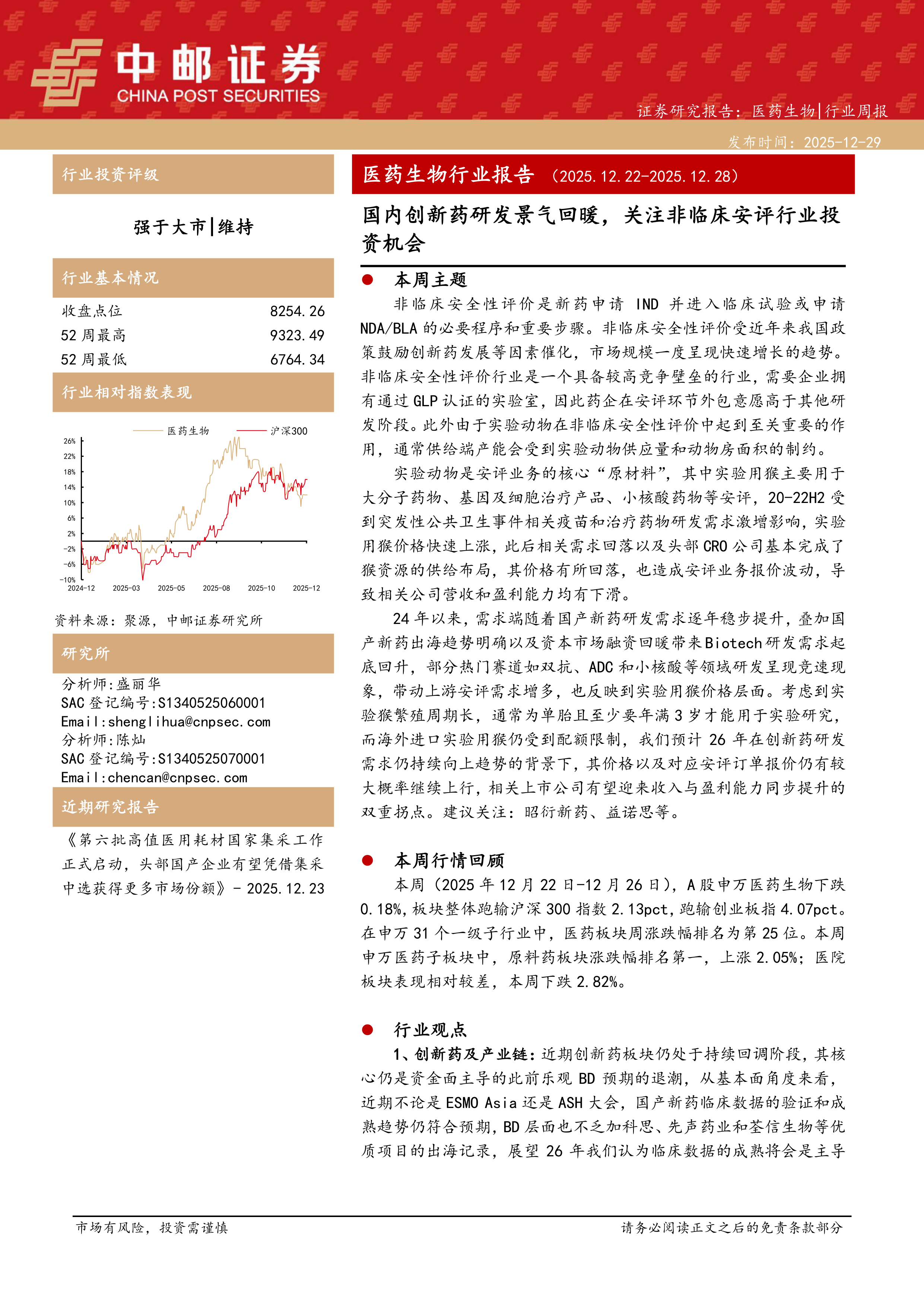 医药生物行业周报:国内创新药研发景气回暖,关注非临床安评行业投资机会