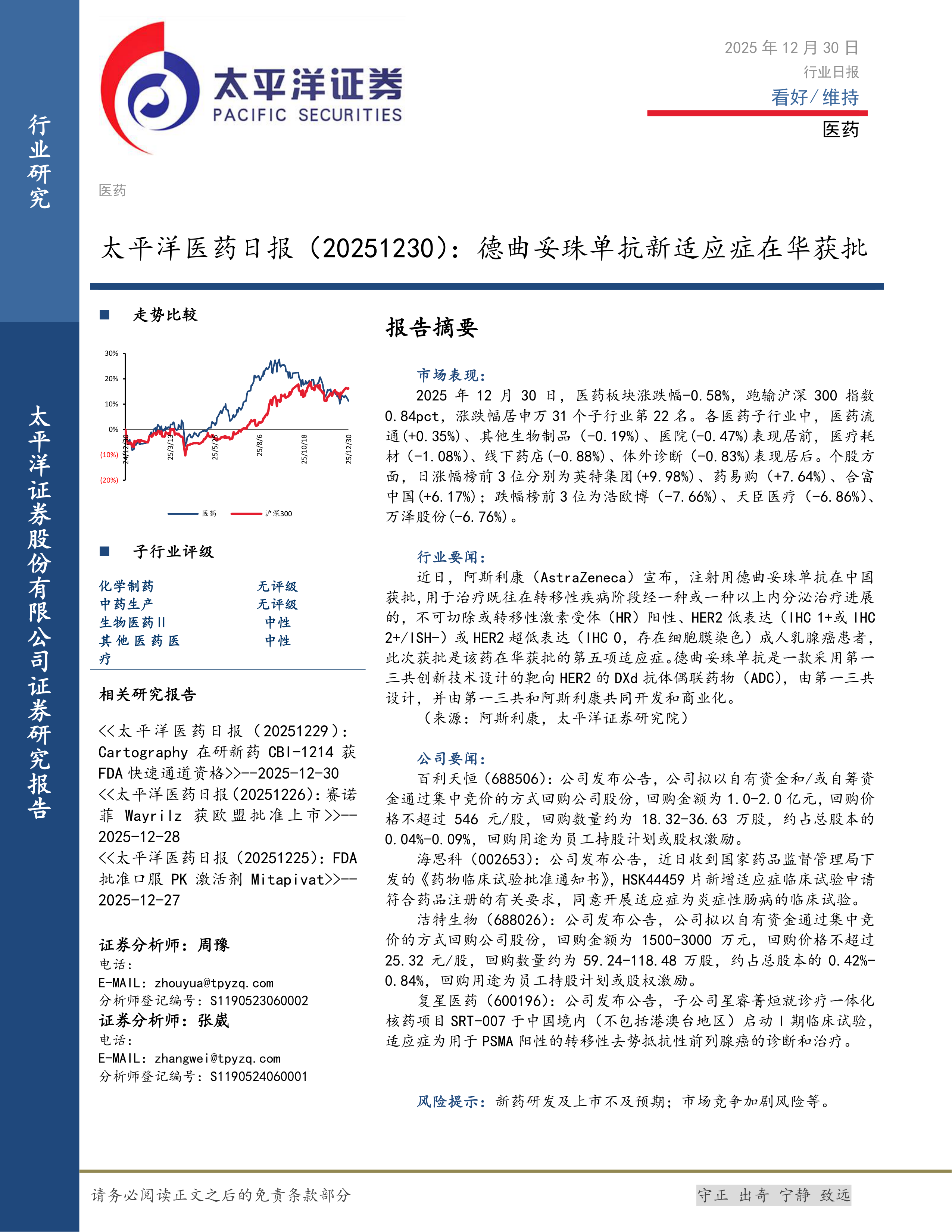 2025年12月30日,医药板块涨跌幅-0.58%,跑输沪深300指数0.84pct,涨跌幅居申万31个子行业第22名。各医药子行业中,医药流通(+0.35%)、其他生物制品(-0.19%)、医院(-0.47%)表现居前,医疗耗材(-1.08%)、线下药店(-0.88%)、体外诊断(-0.83%)表现居后。个股方面,日涨幅榜前3位分别为英特集团(+9.98%)、药易购(+7.64%)、合富中国(+6.17%);跌幅榜前3位为浩欧博(-7.66%)、天臣医疗(-6.86%)、万泽股份(-6.76%)。