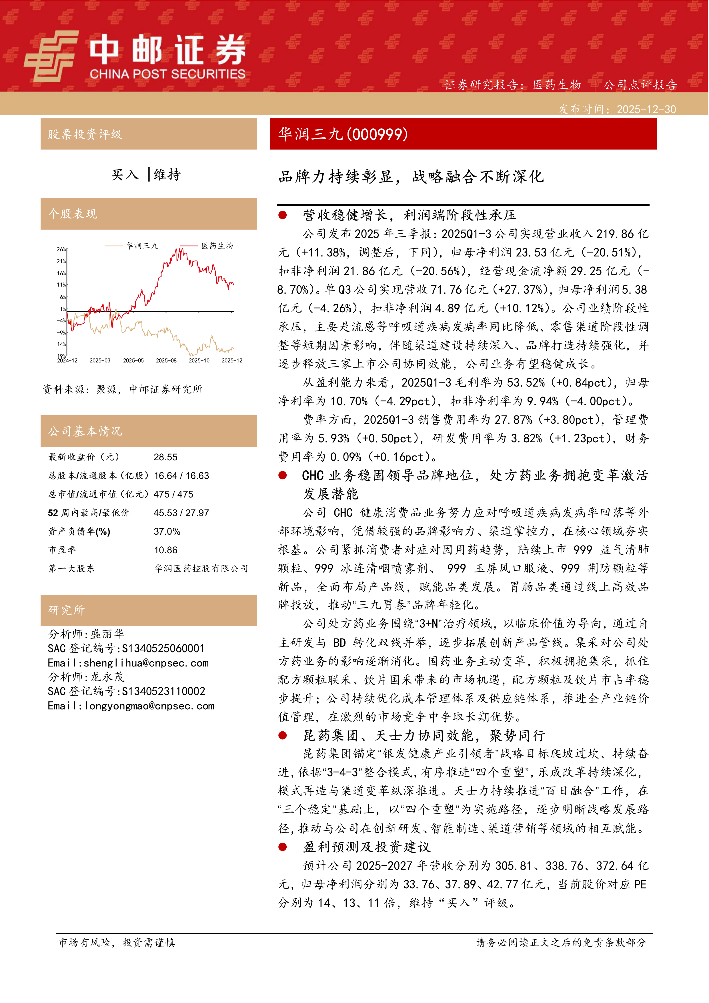 公司发布2025年三季报:2025Q1-3公司实现营业收入219.86亿元(+11.38%,调整后,下同),归母净利润23.53亿元(-20.51%),扣非净利润21.86亿元(-20.56%),经营现金流净额29.25亿元(-8.70%)。单Q3公司实现营收71.76亿元(+27.37%),归母净利润5.38亿元(-4.26%),扣非净利润4.89亿元(+10.12%)。公司业绩阶段性承压,主要是流感等呼吸道疾病发病率同比降低、零售渠道阶段性调整等短期因素影响,伴随渠道建设持续深入、品牌打造持续强化,并逐步释放三家上市公司协同效能,公司业务有望稳健成长。