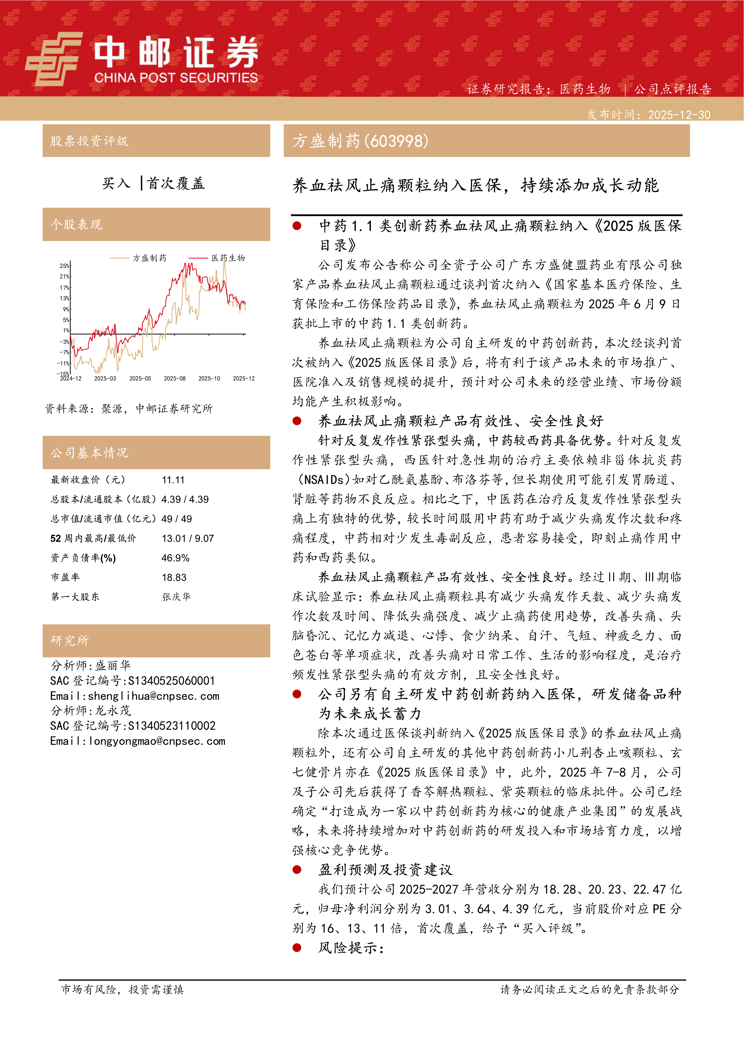 养血祛风止痛颗粒为公司自主研发的中药创新药,本次经谈判首次被纳入《2025版医保目录》后,将有利于该产品未来的市场推广、医院准入及销售规模的提升,预计对公司未来的经营业绩、市场份额均能产生积极影响。