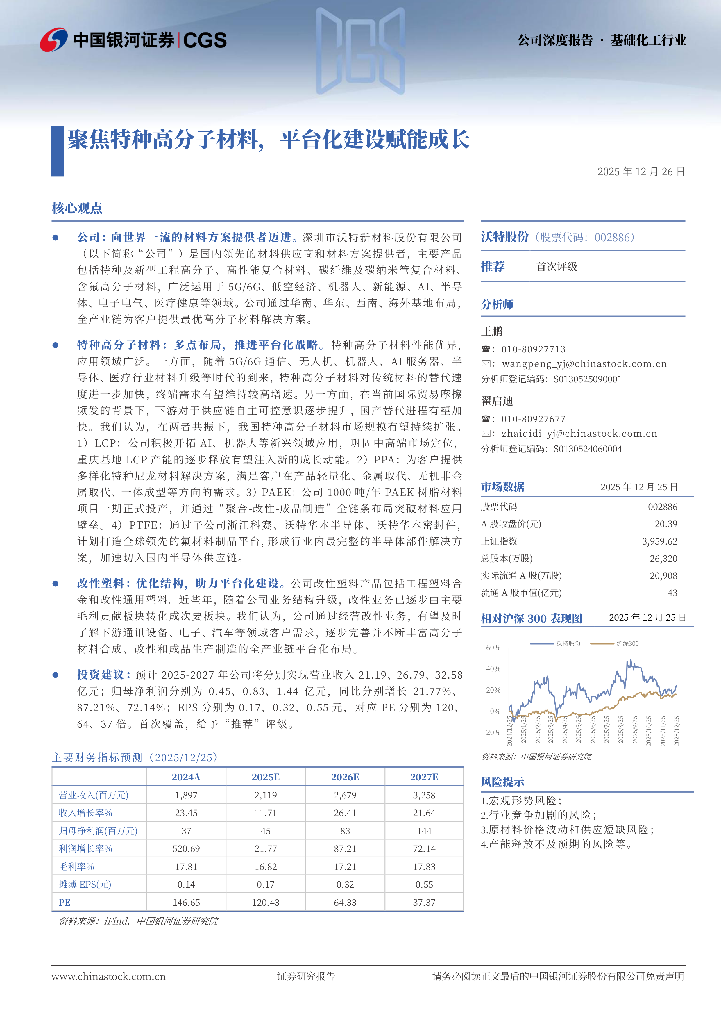 特种高分子材料:多点布局,推进平台化战略。特种高分子材料性能优异,应用领域广泛。一方面,随着5G/6G通信、无人机、机器人、AI服务器、半导体、医疗行业材料升级等时代的到来,特种高分子材料对传统材料的替代速度进一步加快,终端需求有望维持较高增速。另一方面,在当前国际贸易摩擦频发的背景下,下游对于供应链自主可控意识逐步提升,国产替代进程有望加快。我们认为,在两者共振下,我国特种高分子材料市场规模有望持续扩张。1)LCP:公司积极开拓AI、机器人等新兴领域应用,巩固中高端市场定位,重庆基地LCP产能的逐步释放有望注入新的成长动能。2)PPA:为客户提供多样化特种尼龙材料解决方案,满足客户在产品轻量化、金属取代、无机非金属取代、一体成型等方向的需求。3)PAEK:公司1000吨/年PAEK树脂材料项目一期正式投产,并通过“聚合-改性-成品制造”全链条布局突破材料应用壁垒。4)PTFE:通过子公司浙江科赛、沃特华本半导体、沃特华本密封件,计划打造全球领先的氟材料制品平台,形成行业内最完整的半导体部件解决方案,加速切入国内半导体供应链。