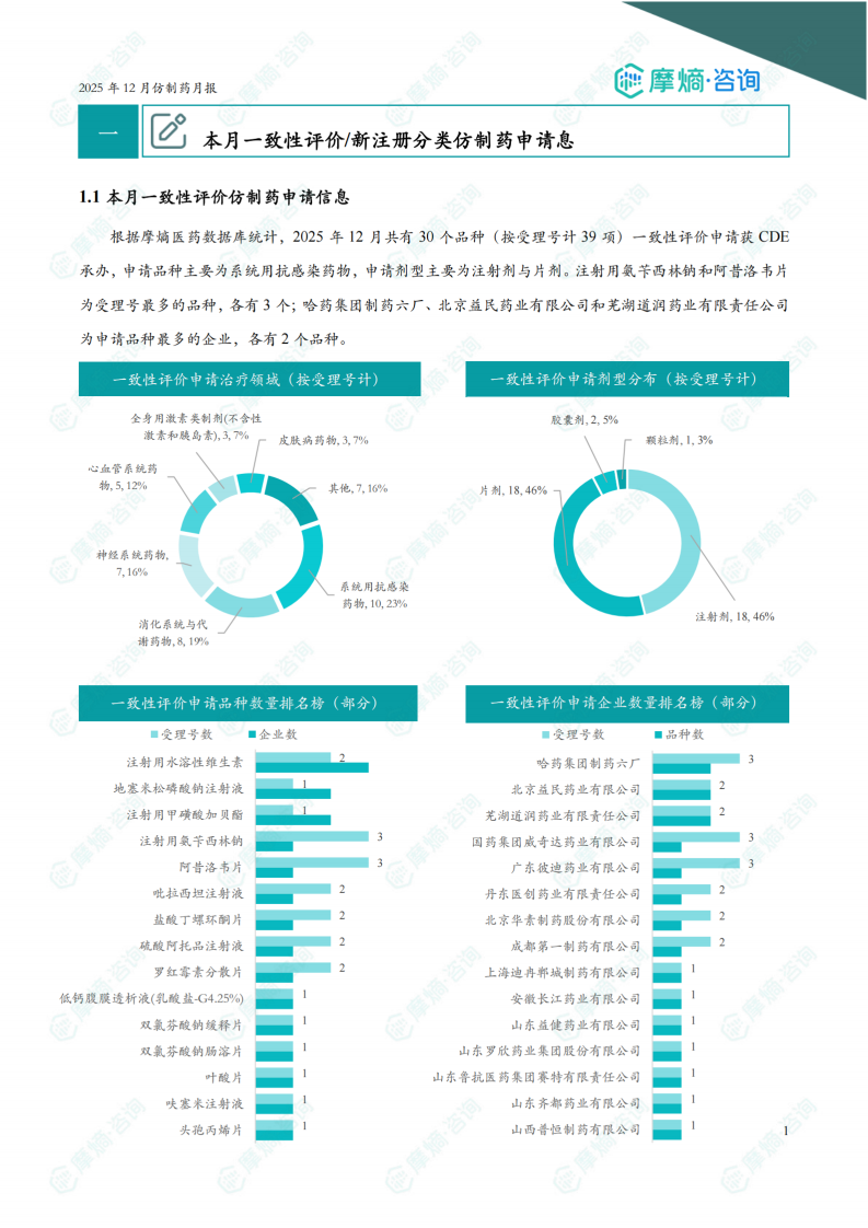 根据摩熵医药数据库统计,2025年12月共有30个品种(按受理号计39项)一致性评价申请获CDE承办,申请品种主要为系统用抗感染药物,申请剂型主要为注射剂与片剂。注射用氨苄西林钠和阿昔洛韦片为受理号最多的品种,各有3个;哈药集团制药六厂、北京益民药业有限公司和芜湖道润药业有限责任公司为申请品种最多的企业,各有2个品种。