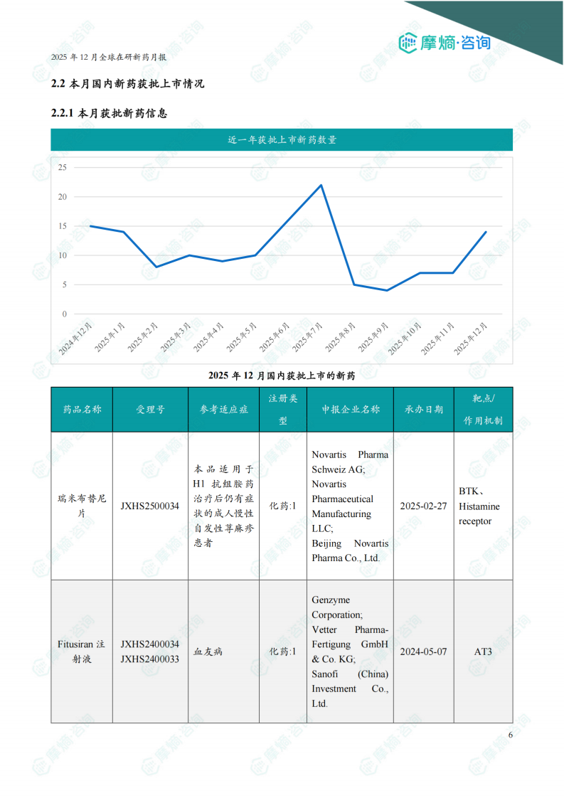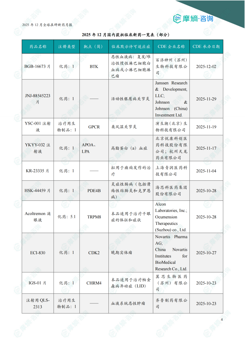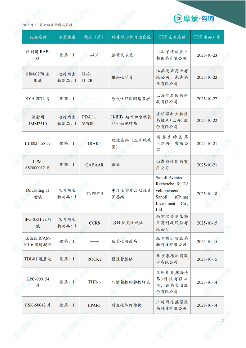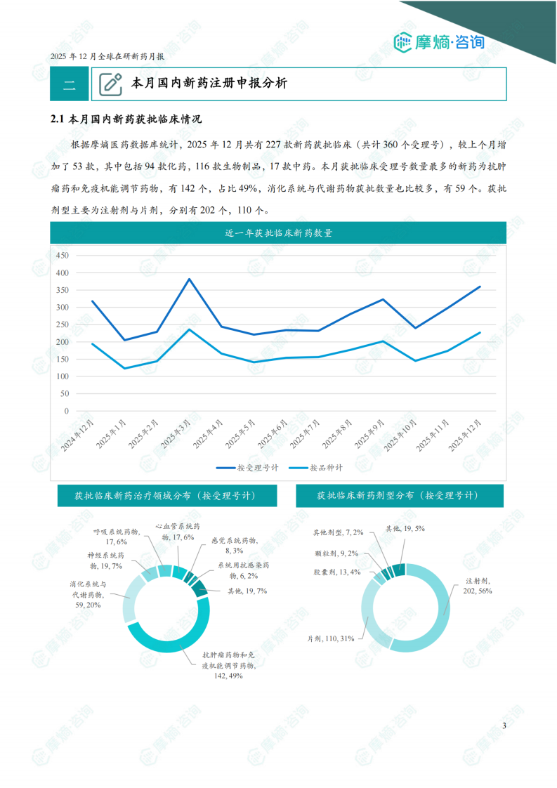 根据摩熵医药数据库统计,2025年12月共有227款新药获批临床(共计360个受理号),较上个月增加了53款,其中包括94款化药,116款生物制品,17款中药。本月获批临床受理号数量最多的新药为抗肿瘤药和免疫机能调节药物,有142个,占比49%,消化系统与代谢药物获批数量也比较多,有59个。获批剂型主要为注射剂与片剂,分别有202个,110个。