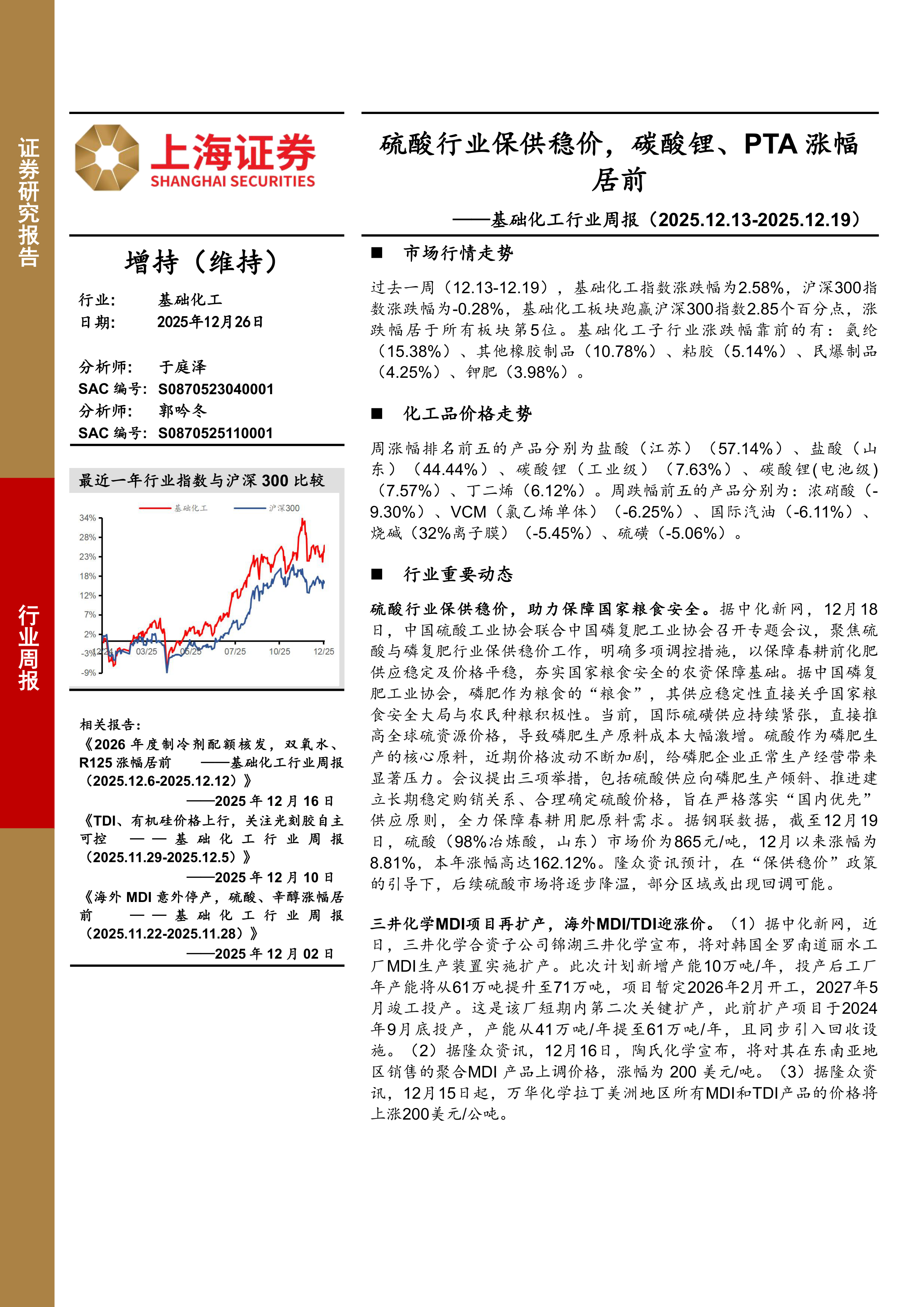 基础化工行业周报:硫酸行业保供稳价,碳酸锂、PTA涨幅居前