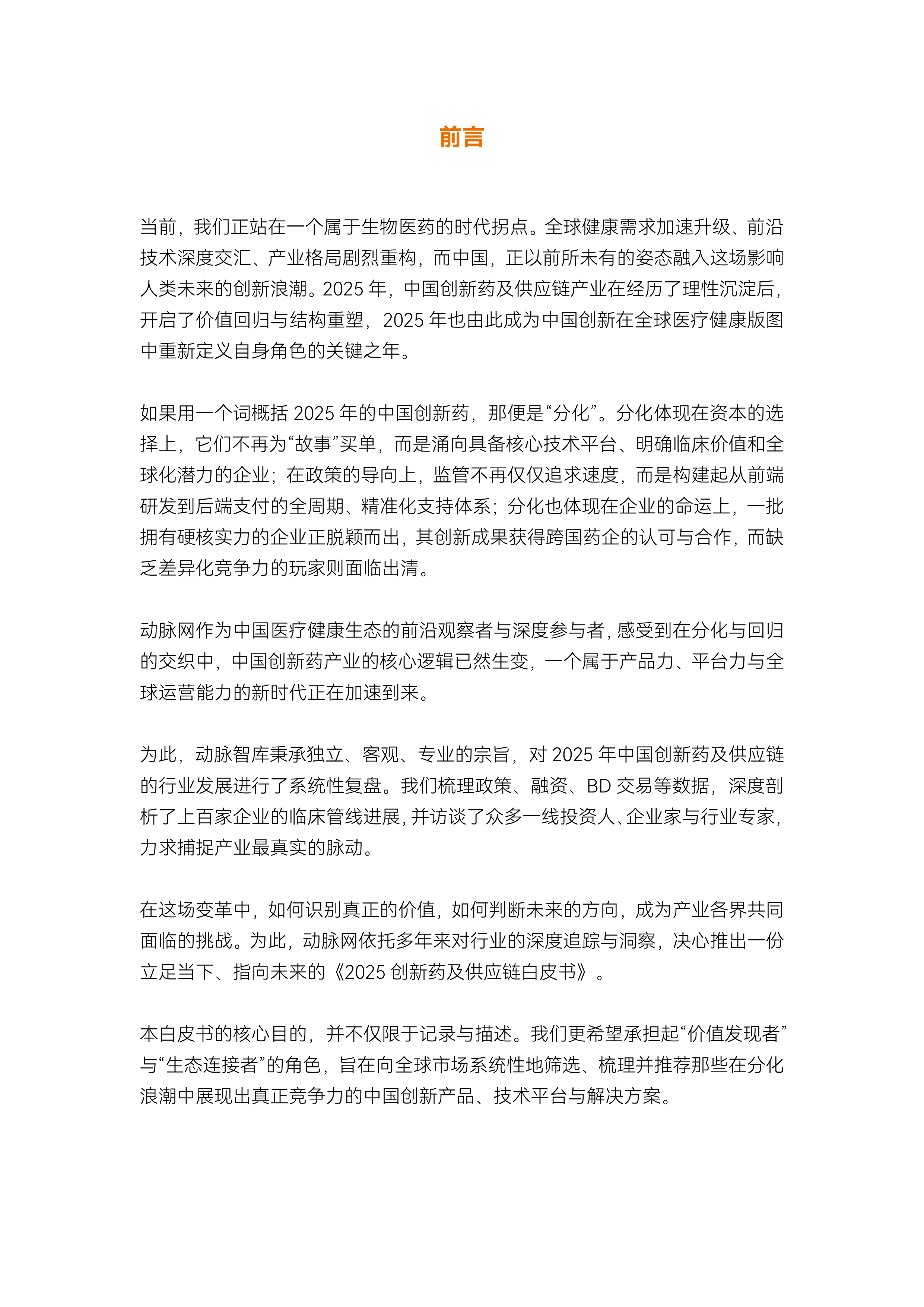 为此,动脉智库秉承独立、客观、专业的宗旨,对2025年中国创新药及供应链的行业发展进行了系统性复盘。我们梳理政策、融资、BD交易等数据,深度剖析了上百家企业的临床管线进展,并访谈了众多一线投资人、企业家与行业专家,力求捕捉产业最真实的脉动。