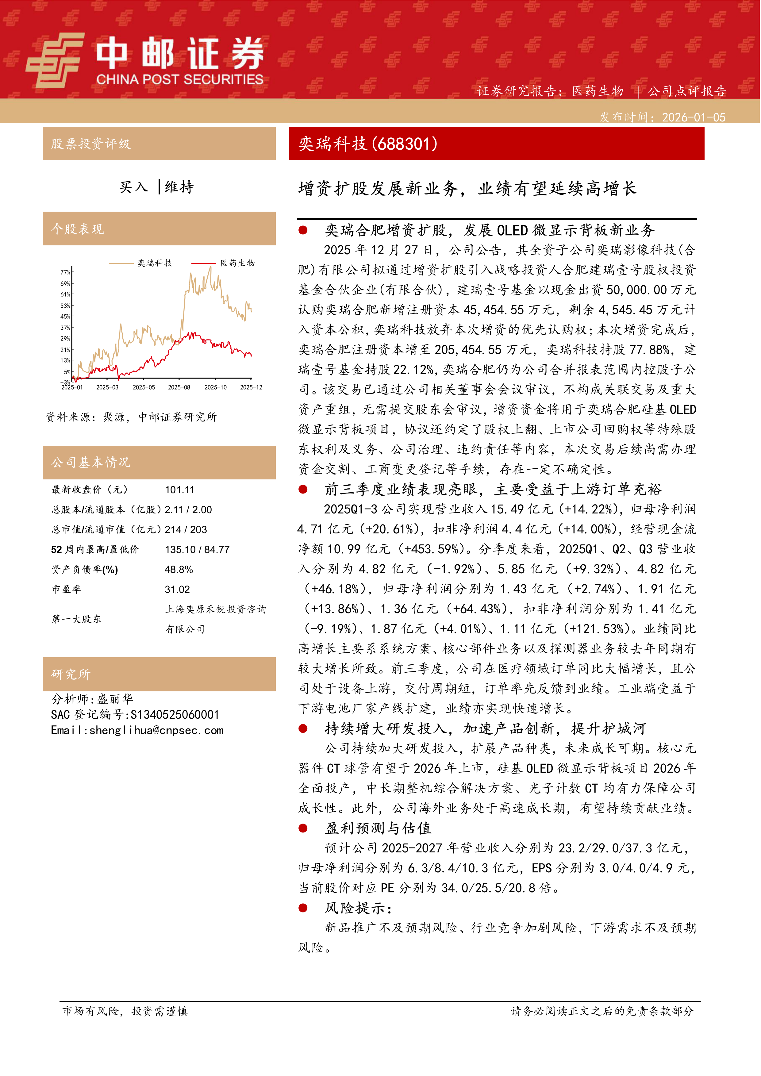 公司持续加大研发投入,扩展产品种类,未来成长可期。核心元器件CT球管有望于2026年上市,硅基OLED微显示背板项目2026年全面投产,中长期整机综合解决方案、光子计数CT均有力保障公司成长性。此外,公司海外业务处于高速成长期,有望持续贡献业绩。