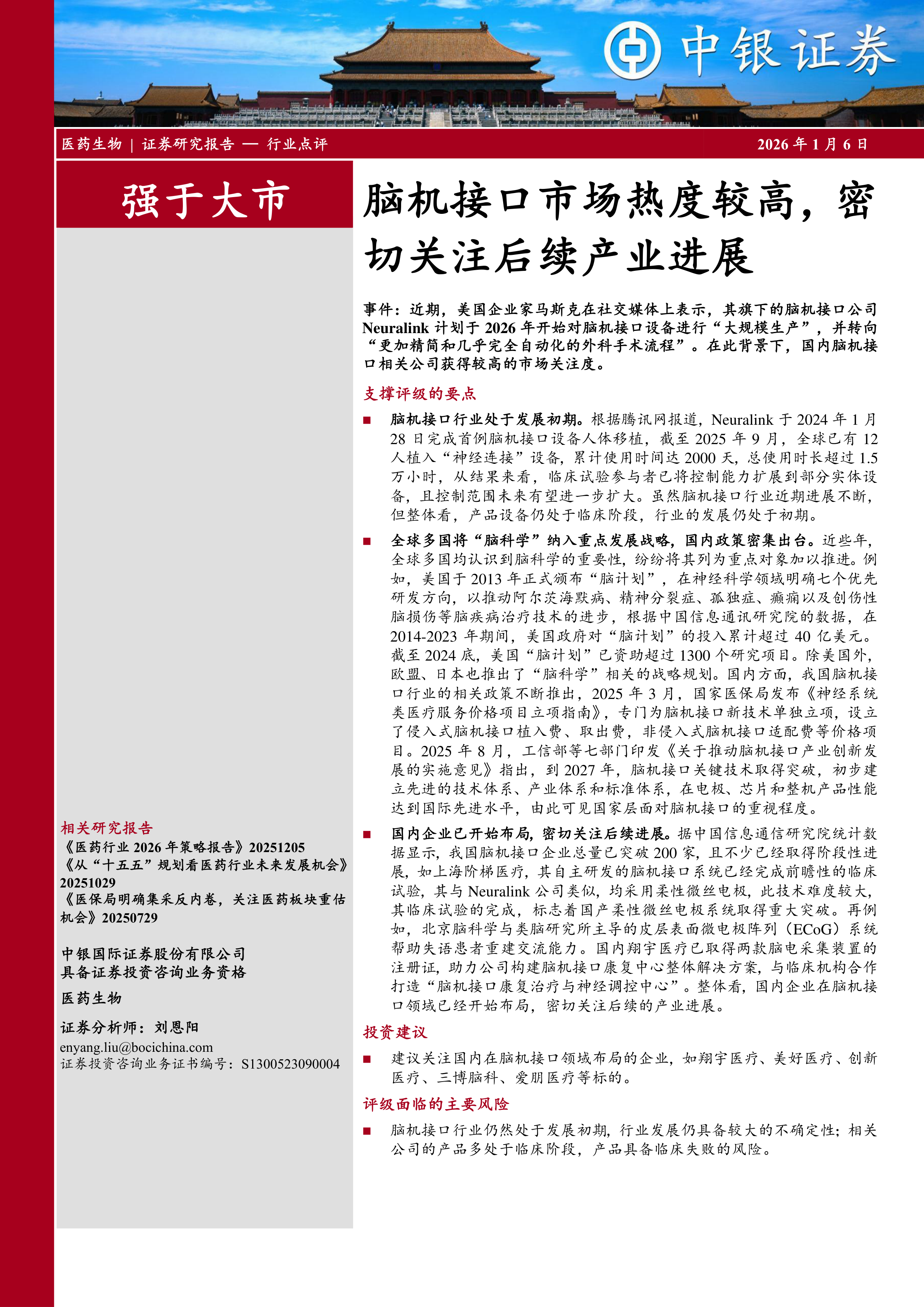 建议关注国内在脑机接口领域布局的企业,如翔宇医疗、美好医疗、创新医疗、三博脑科、爱朋医疗等标的。