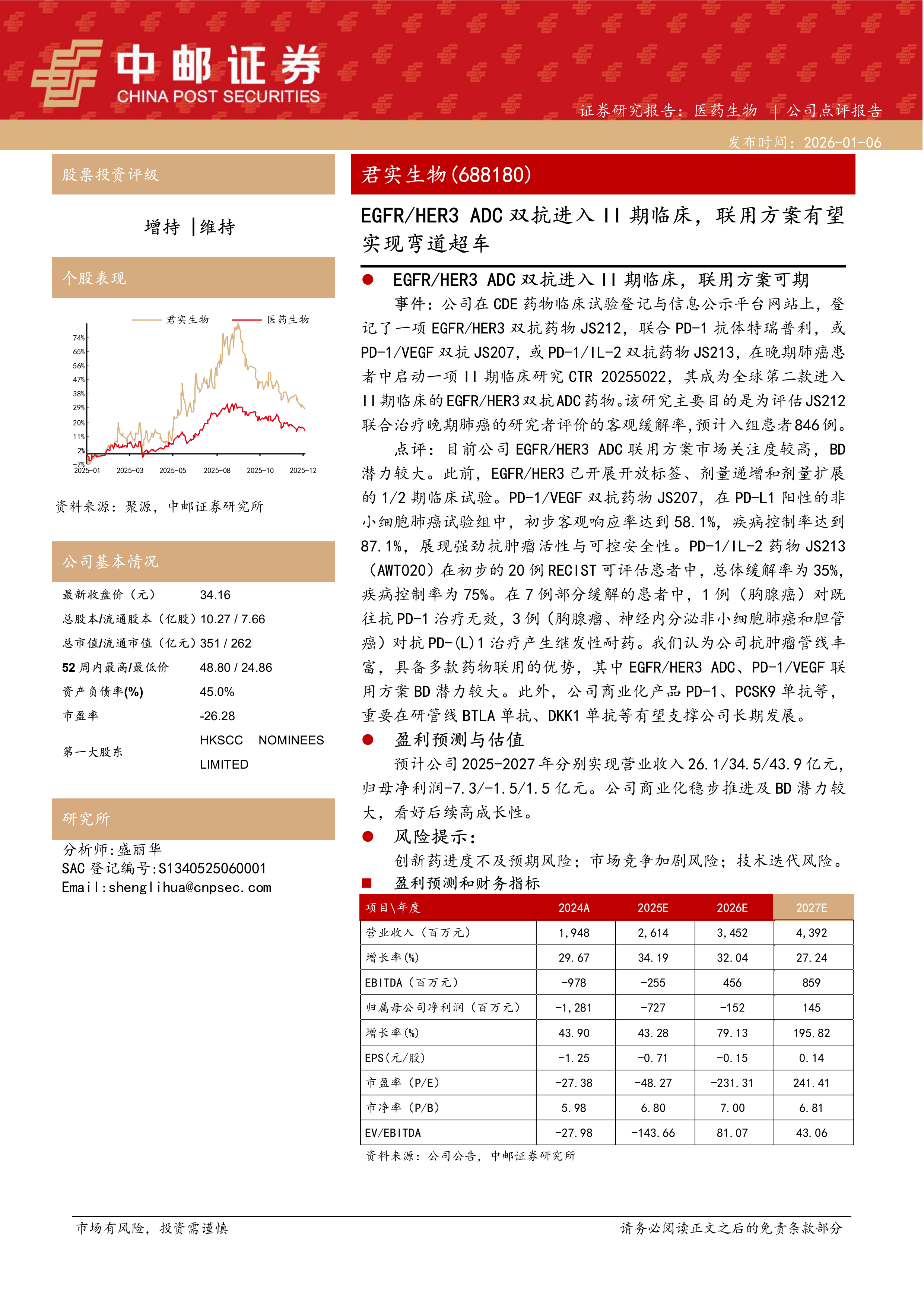 点评:目前公司EGFR/HER3ADC联用方案市场关注度较高,BD潜力较大。此前,EGFR/HER3已开展开放标签、剂量递增和剂量扩展的1/2期临床试验。PD-1/VEGF双抗药物JS207,在PD-L1阳性的非小细胞肺癌试验组中,初步客观响应率达到58.1%,疾病控制率达到87.1%,展现强劲抗肿瘤活性与可控安全性。PD-1/IL-2药物JS213(AWT020)在初步的20例RECIST可评估患者中,总体缓解率为35%,疾病控制率为75%。在7例部分缓解的患者中,1例(胸腺癌)对既往抗PD-1治疗无效,3例(胸腺瘤、神经内分泌非小细胞肺癌和胆管癌)对抗PD-(L)1治疗产生继发性耐药。我们认为公司抗肿瘤管线丰富,具备多款药物联用的优势,其中EGFR/HER3ADC、PD-1/VEGF联用方案BD潜力较大。此外,公司商业化产品PD-1、PCSK9单抗等,重要在研管线BTLA单抗、DKK1单抗等有望支撑公司长期发展。