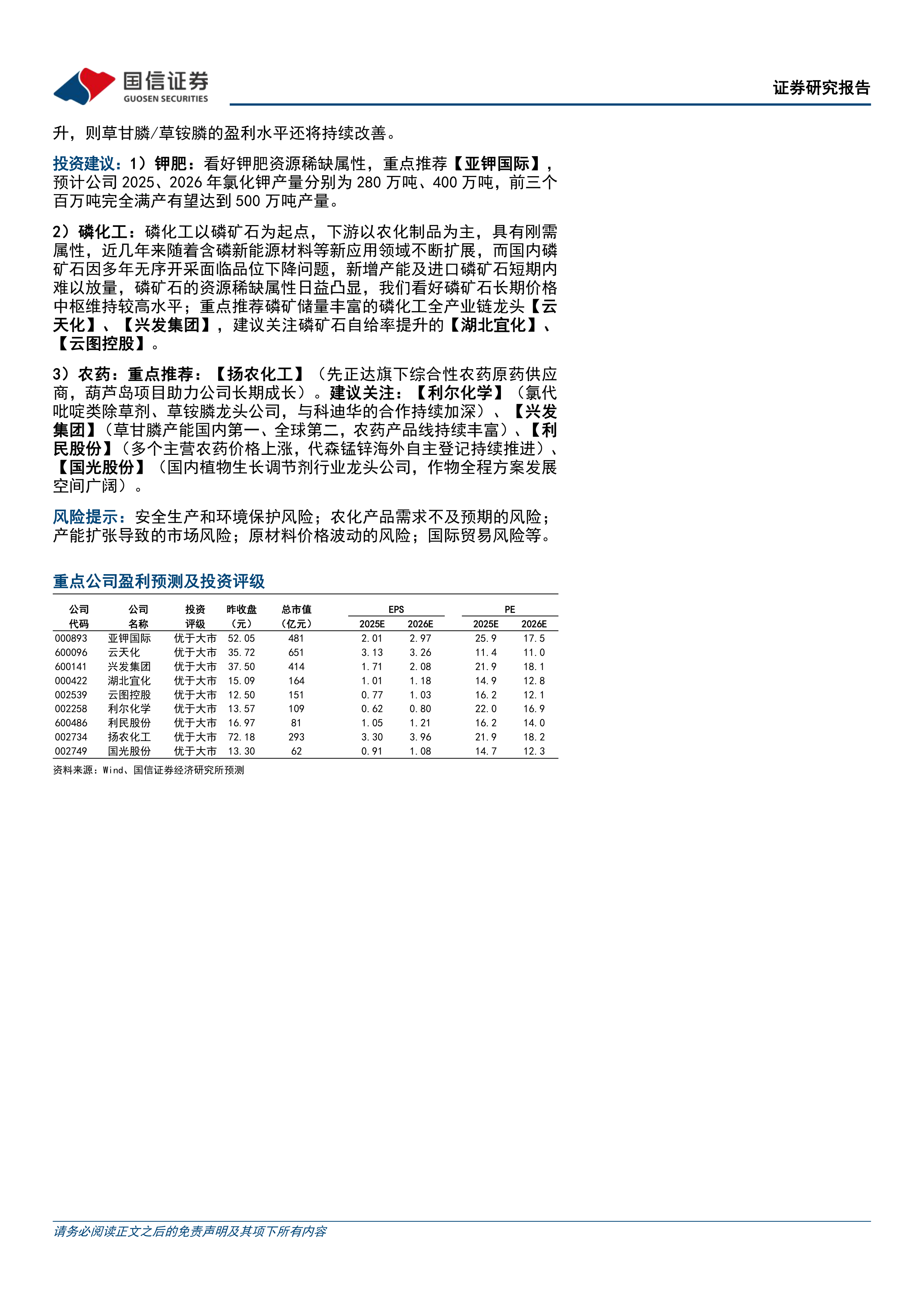 风险提示:安全生产和环境保护风险;农化产品需求不及预期的风险;产能扩张导致的市场风险;原材料价格波动的风险;国际贸易风险等。