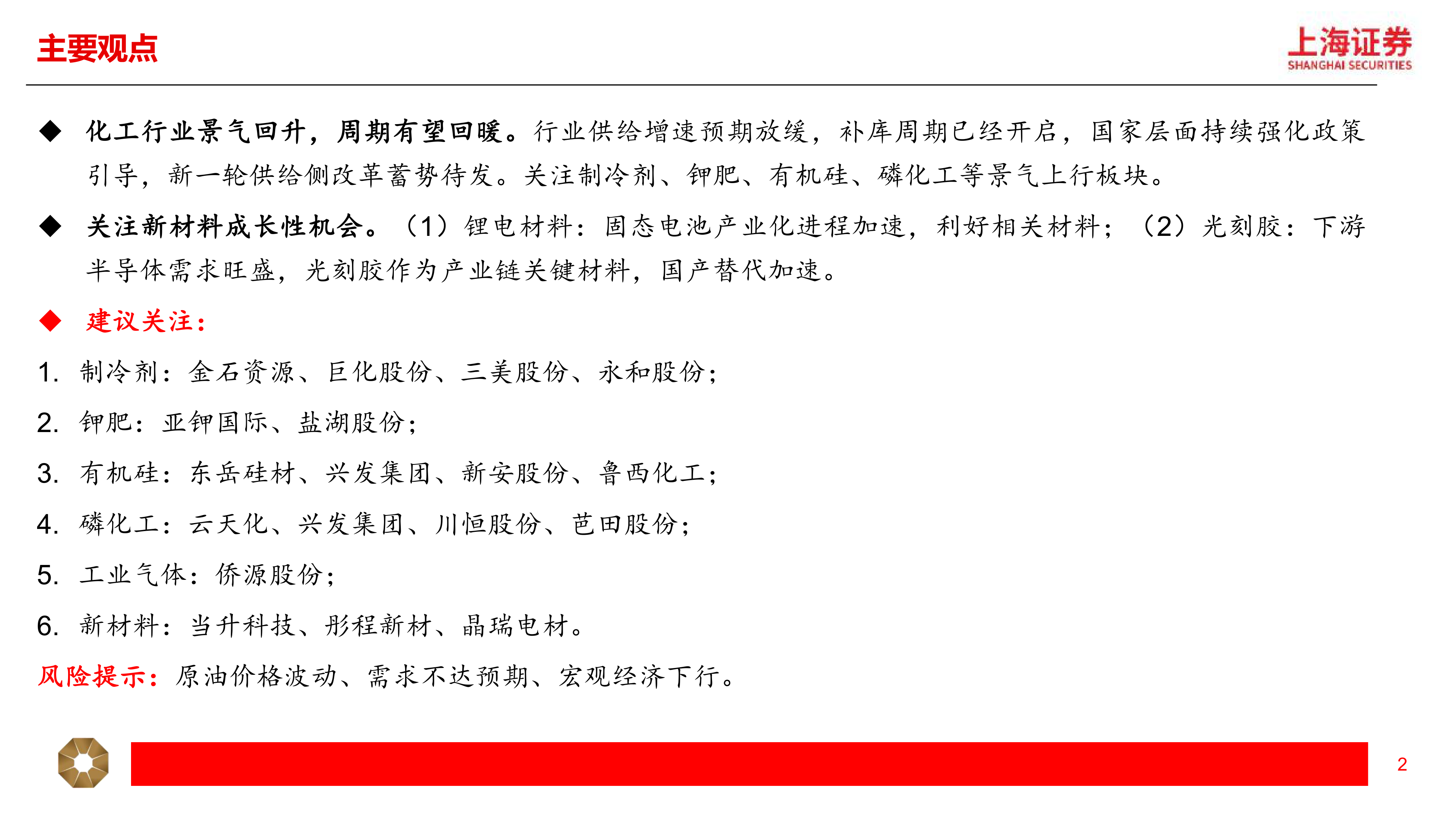 化工行业景气回升,周期有望回暖。行业供给增速预期放缓,补库周期已经开启,国家层面持续强化政策引导,新一轮供给侧改革蓄势待发。关注制冷剂、钾肥、有机硅、磷化工等景气上行板块。