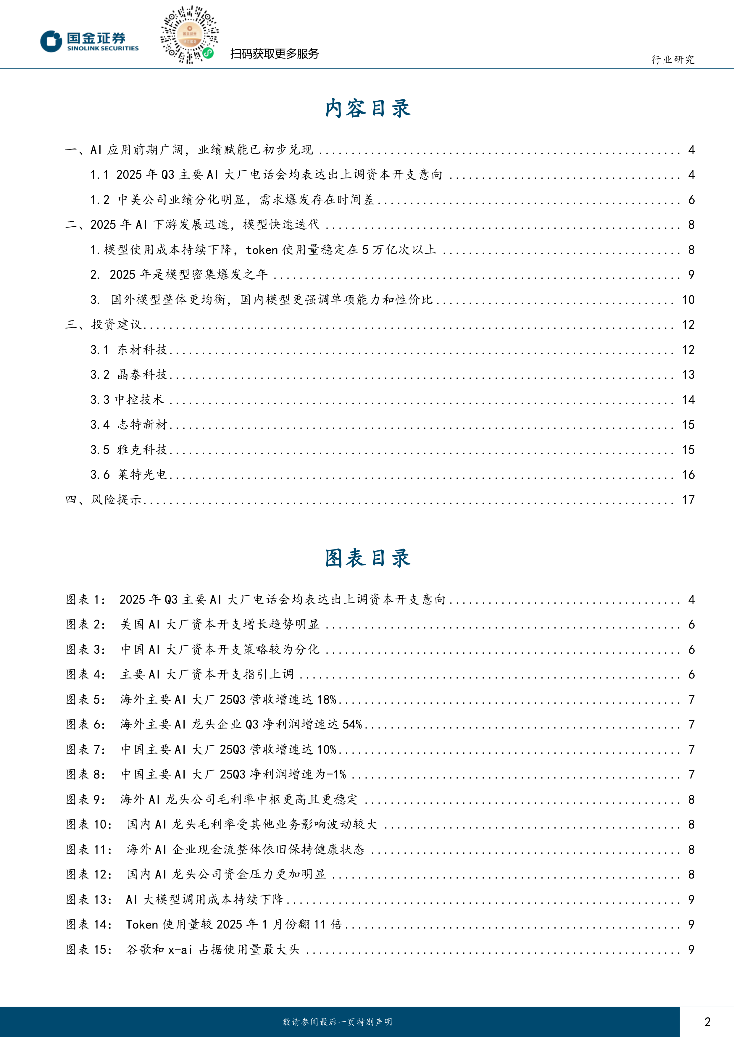 ②中美业绩分化与时间差仍在,海外硬件与云更先兑现,国内整体相对滞后但结构性增量明确。北美AI产业链中,硬件与基础设施环节率先释放利润弹性,海外主要大厂2025年前三季度营收1.4万亿美元(同比+18%),净利润3799亿美元(同比+35%)。其中硬件厂商增速最快:英伟达前三季度营业收入1478亿美元(同比+51%),净利润771亿美元(同比+76%);国内AI应用型公司整体业绩表现相对平淡,主要AI应用大厂2025年前三季度营业总营收2879亿美元(同比+10%),净利润405亿美元(同比-1%),但AI板块增速与投入强度持续提升,部分公司开始披露AI业务收入并保持高增长,后续仍处在爬坡阶段。