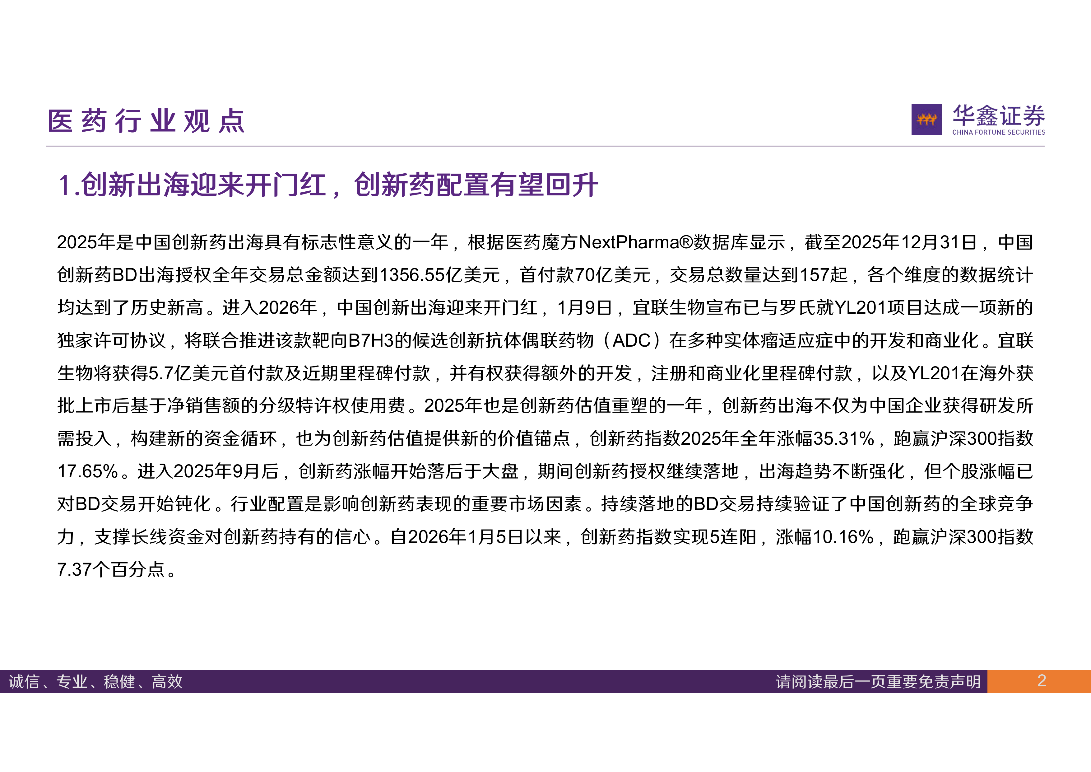 2025年是中国创新药出海具有标志性意义的一年,根据医药魔方NextPharma®数据库显示,截至2025年12月31日,中国创新药BD出海授权全年交易总金额达到1356.55亿美元,首付款70亿美元,交易总数量达到157起,各个维度的数据统计均达到了历史新高。进入2026年,中国创新出海迎来开门红,1月9日,宜联生物宣布已与罗氏就YL201项目达成一项新的独家许可协议,将联合推进该款靶向B7H3的候选创新抗体偶联药物(ADC)在多种实体瘤适应症中的开发和商业化。宜联生物将获得5.7亿美元首付款及近期里程碑付款,并有权获得额外的开发,注册和商业化里程碑付款,以及YL201在海外获批上市后基于净销售额的分级特许权使用费。2025年也是创新药估值重塑的一年,创新药出海不仅为中国企业获得研发所需投入,构建新的资金循环,也为创新药估值提供新的价值锚点,创新药指数2025年全年涨幅35.31%,跑赢沪深300指数17.65%。进入2025年9月后,创新药涨幅开始落后于大盘,期间创新药授权继续落地,出海趋势不断强化,但个股涨幅已对BD交易开始钝化。行业配置是影响创新药表现的重要市场因素。持续落地的BD交易持续验证了中国创新药的全球竞争力,支撑长线资金对创新药持有的信心。自2026年1月5日以来,创新药指数实现5连阳,涨幅10.16%,跑赢沪深300指数7.37个百分点。