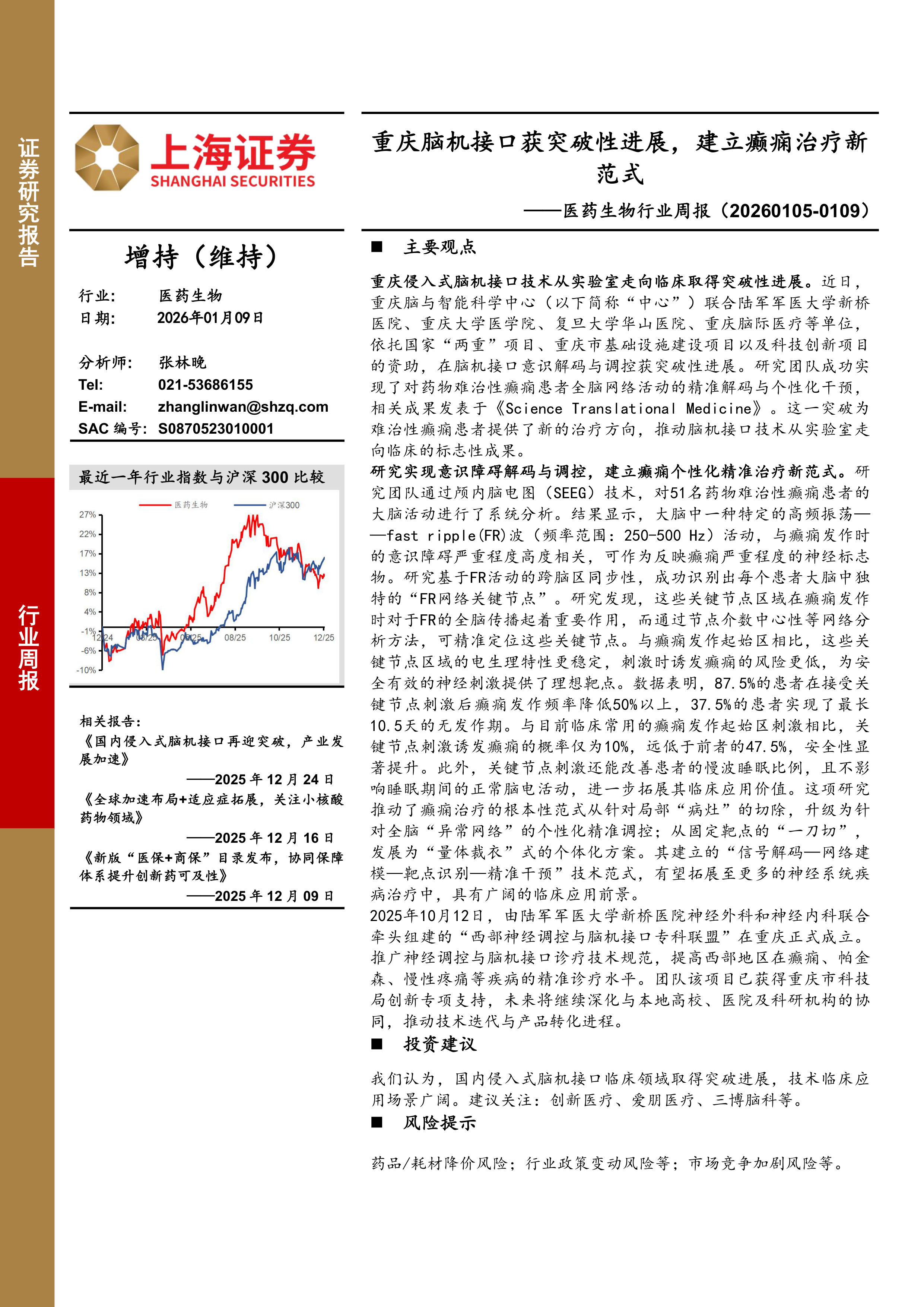 医药生物行业周报:重庆脑机接口获突破性进展,建立癫痫治疗新范式