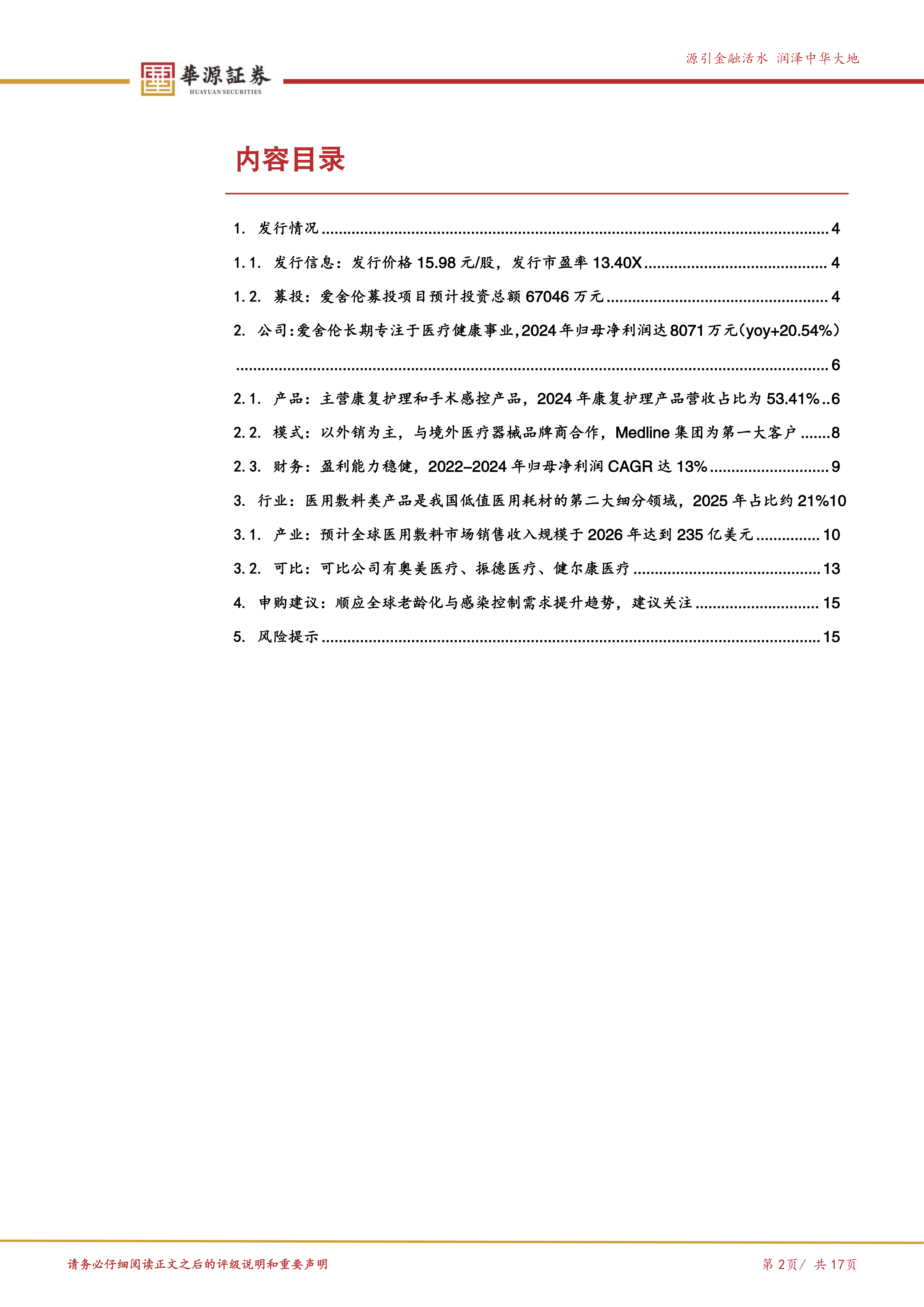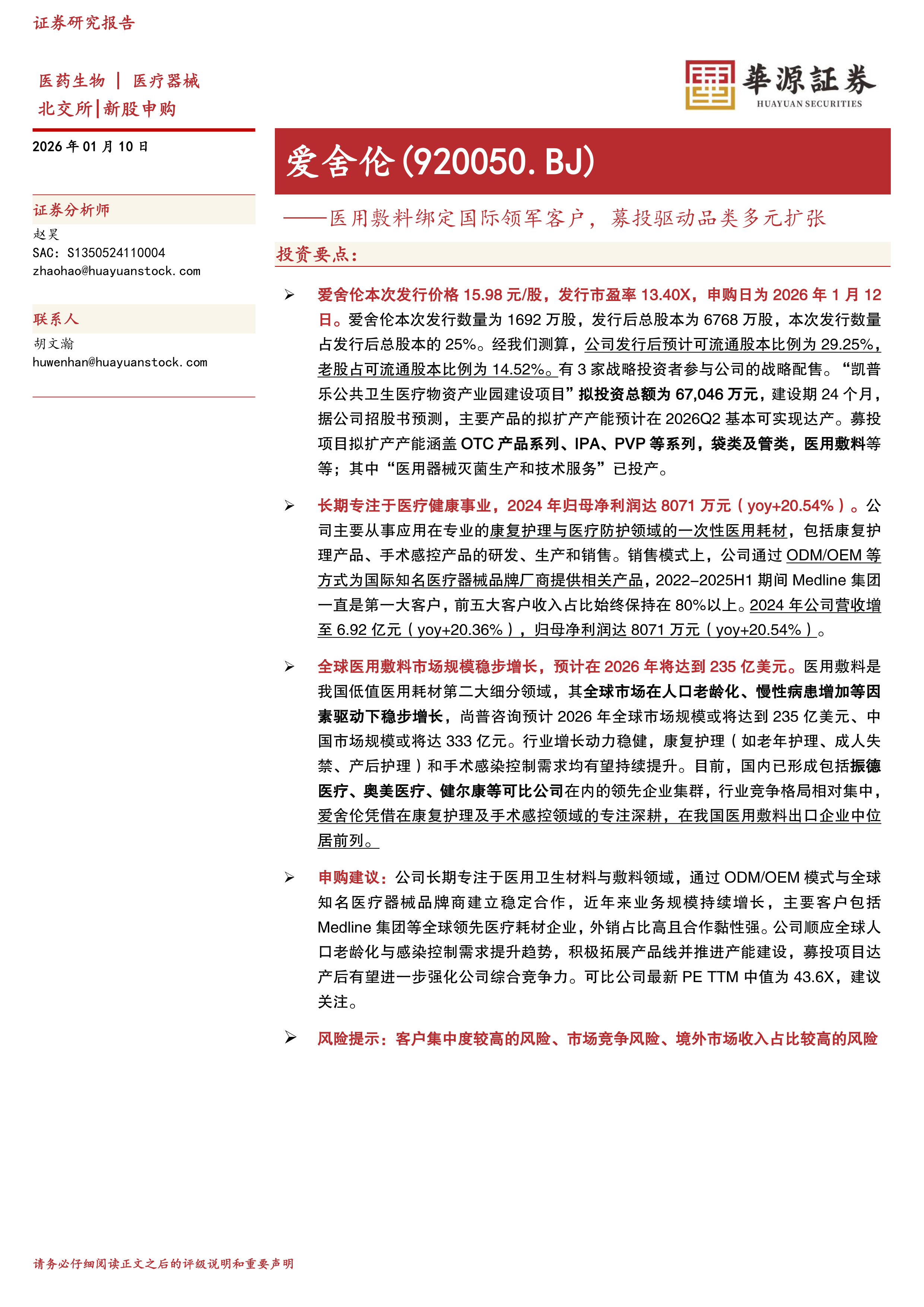 申购建议:公司长期专注于医用卫生材料与敷料领域,通过ODM/OEM模式与全球知名医疗器械品牌商建立稳定合作,近年来业务规模持续增长,主要客户包括Medline集团等全球领先医疗耗材企业,外销占比高且合作黏性强。公司顺应全球人口老龄化与感染控制需求提升趋势,积极拓展产品线并推进产能建设,募投项目达产后有望进一步强化公司综合竞争力。可比公司最新PETTM中值为43.6X,建议关注。
