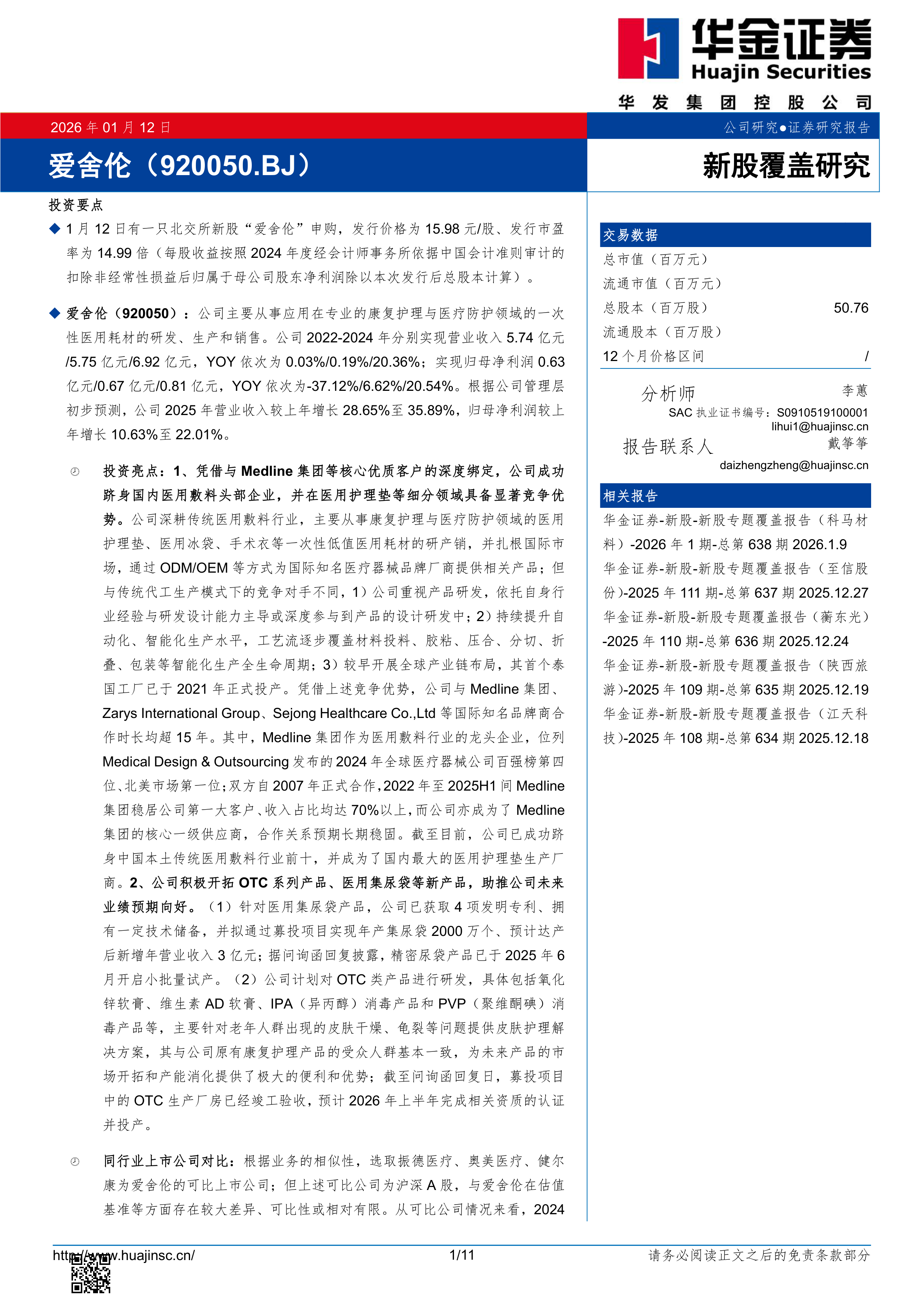 投资亮点:1、凭借与Medline集团等核心优质客户的深度绑定,公司成功跻身国内医用敷料头部企业,并在医用护理垫等细分领域具备显著竞争优势。公司深耕传统医用敷料行业,主要从事康复护理与医疗防护领域的医用护理垫、医用冰袋、手术衣等一次性低值医用耗材的研产销,并扎根国际市场,通过ODM/OEM等方式为国际知名医疗器械品牌厂商提供相关产品;但与传统代工生产模式下的竞争对手不同,1)公司重视产品研发,依托自身行业经验与研发设计能力主导或深度参与到产品的设计研发中;2)持续提升自动化、智能化生产水平,工艺流逐步覆盖材料投料、胶粘、压合、分切、折叠、包装等智能化生产全生命周期;3)较早开展全球产业链布局,其首个泰国工厂已于2021年正式投产。凭借上述竞争优势,公司与Medline集团、ZarysInternationalGroup、SejongHealthcareCo.,Ltd等国际知名品牌商合作时长均超15年。其中,Medline集团作为医用敷料行业的龙头企业,位列MedicalDesign&Outsourcing发布的2024年全球医疗器械公司百强榜第四位、北美市场第一位;双方自2007年正式合作,2022年至2025H1间Medline集团稳居公司第一大客户、收入占比均达70%以上,而公司亦成为了Medline集团的核心一级供应商,合作关系预期长期稳固。截至目前,公司已成功跻身中国本土传统医用敷料行业前十,并成为了国内最大的医用护理垫生产厂商。2、公司积极开拓OTC系列产品、医用集尿袋等新产品,助推公司未来业绩预期向好。(1)针对医用集尿袋产品,公司已获取4项发明专利、拥有一定技术储备,并拟通过募投项目实现年产集尿袋2000万个、预计达产后新增年营业收入3亿元;据问询函回复披露,精密尿袋产品已于2025年6月开启小批量试产。(2)公司计划对OTC类产品进行研发,具体包括氧化锌软膏、维生素AD软膏、IPA(异丙醇)消毒产品和PVP(聚维酮碘)消毒产品等,主要针对老年人群出现的皮肤干燥、龟裂等问题提供皮肤护理解决方案,其与公司原有康复护理产品的受众人群基本一致,为未来产品的市场开拓和产能消化提供了极大的便利和优势;截至问询函回复日,募投项目中的OTC生产厂房已经竣工验收,预计2026年上半年完成相关资质的认证并投产。