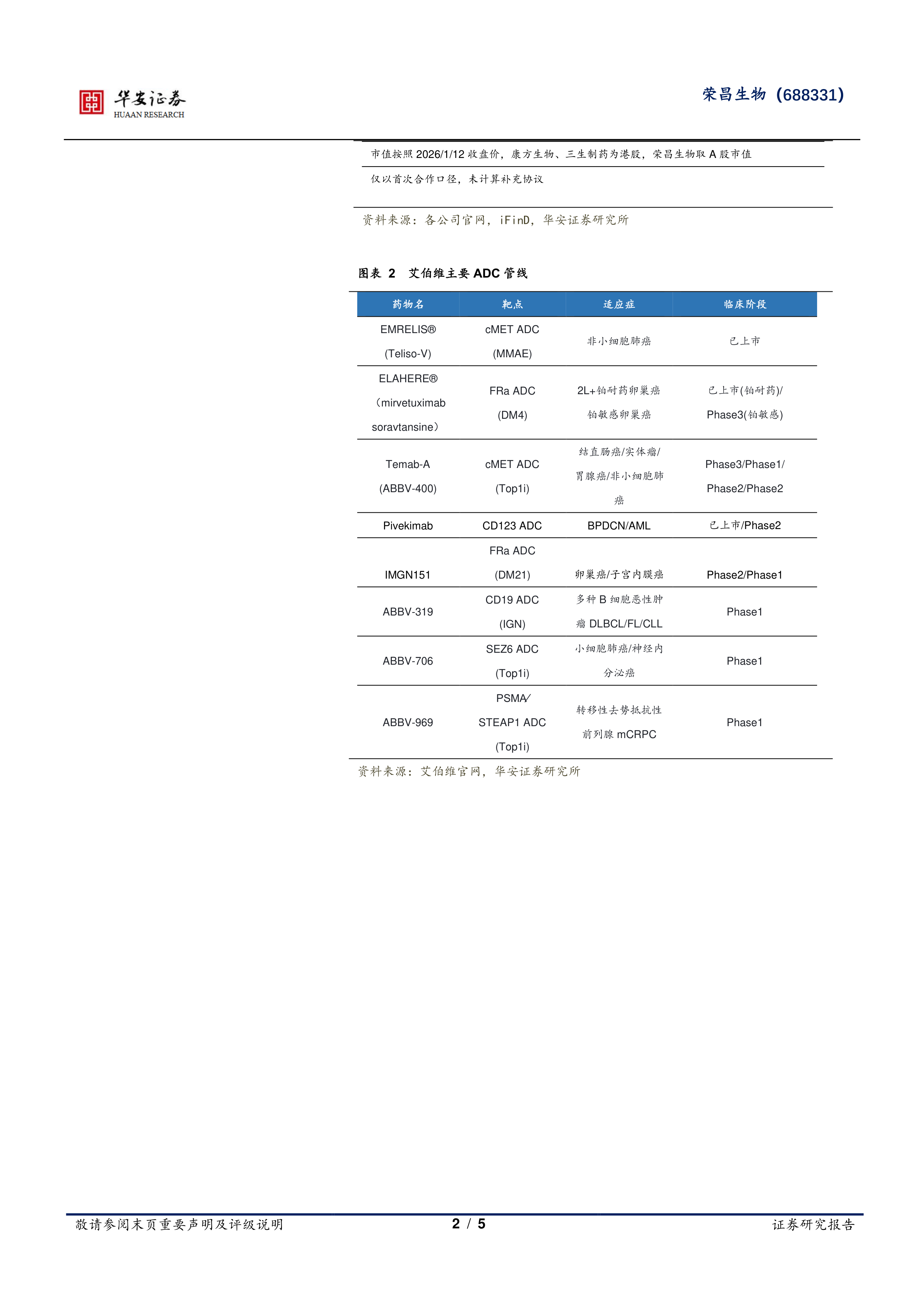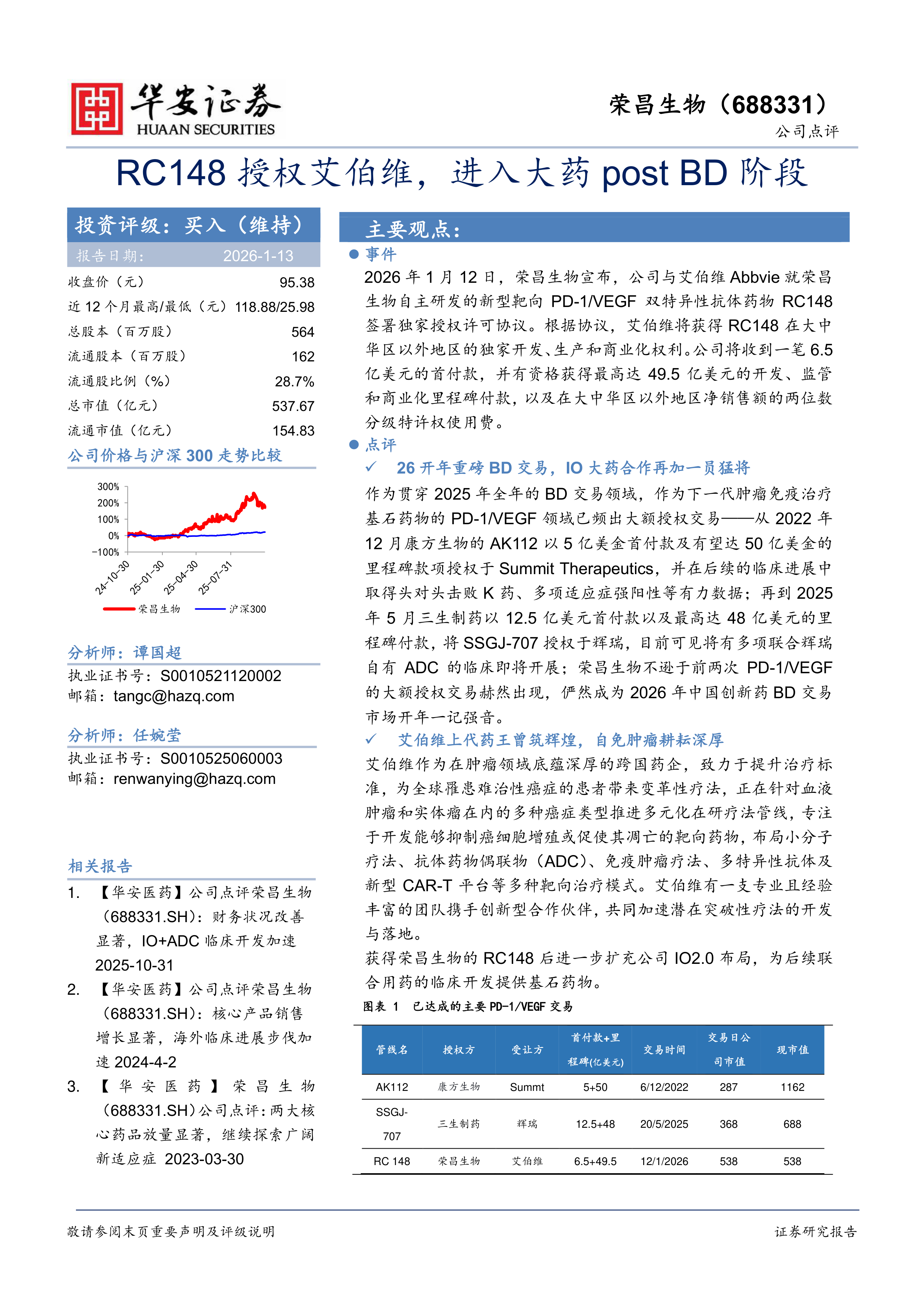 2026 年 1 月 12 日,荣昌生物宣布,公司与艾伯维 Abbvie 就荣昌生物自主研发的新型靶向 PD-1/VEGF 双特异性抗体药物 RC148签署独家授权许可协议。根据协议,艾伯维将获得 RC148 在大中华区以外地区的独家开发、生产和商业化权利。公司将收到一笔 6.5亿美元的首付款,并有资格获得最高达 49.5 亿美元的开发、监管和商业化里程碑付款,以及在大中华区以外地区净销售额的两位数分级特许权使用费。