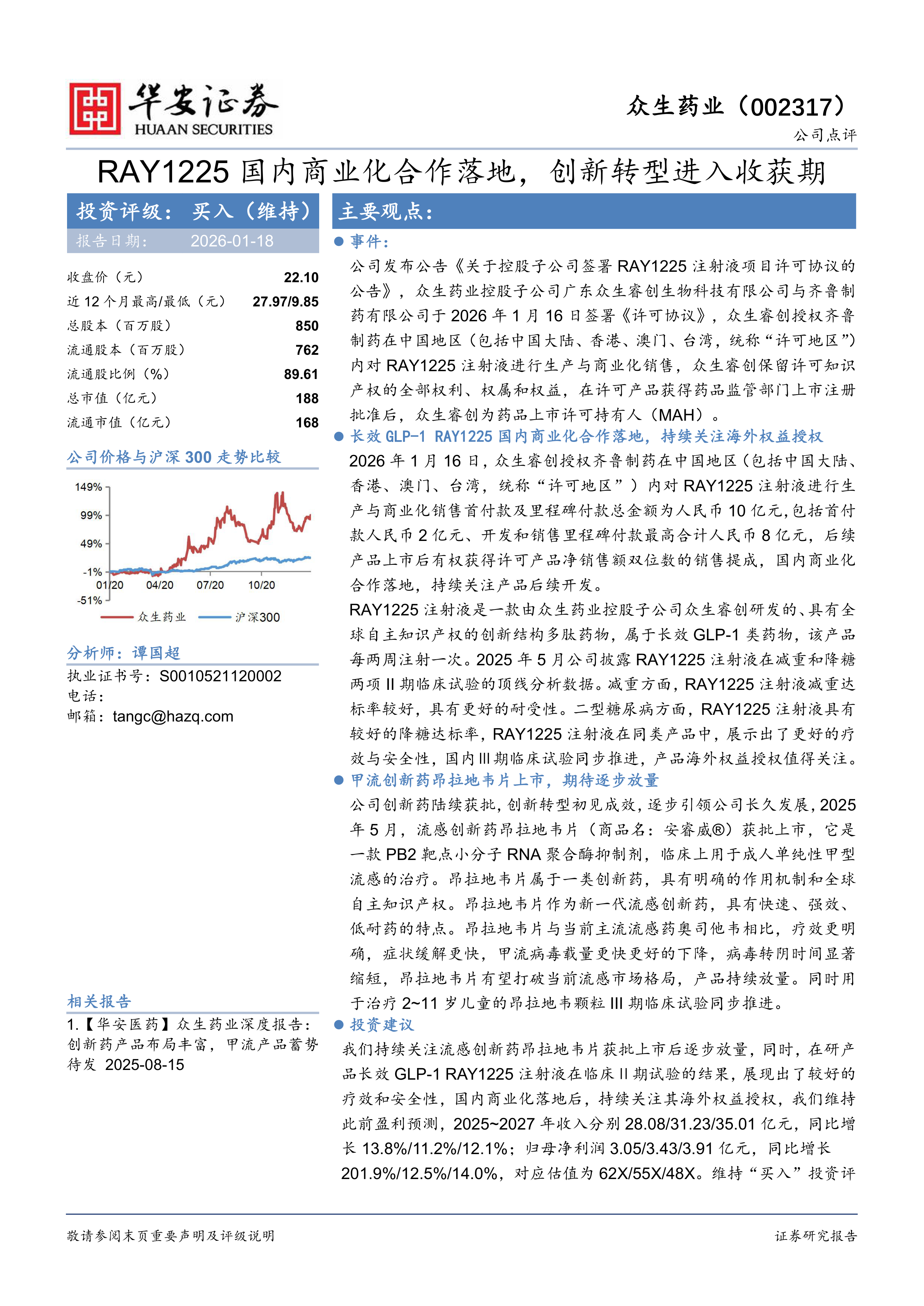 长效GLP-1RAY1225国内商业化合作落地,持续关注海外权益授权2026年1月16日,众生睿创授权齐鲁制药在中国地区(包括中国大陆、香港、澳门、台湾,统称“许可地区”)内对RAY1225注射液进行生产与商业化销售首付款及里程碑付款总金额为人民币10亿元,包括首付款人民币2亿元、开发和销售里程碑付款最高合计人民币8亿元,后续产品上市后有权获得许可产品净销售额双位数的销售提成,国内商业化合作落地,持续关注产品后续开发。