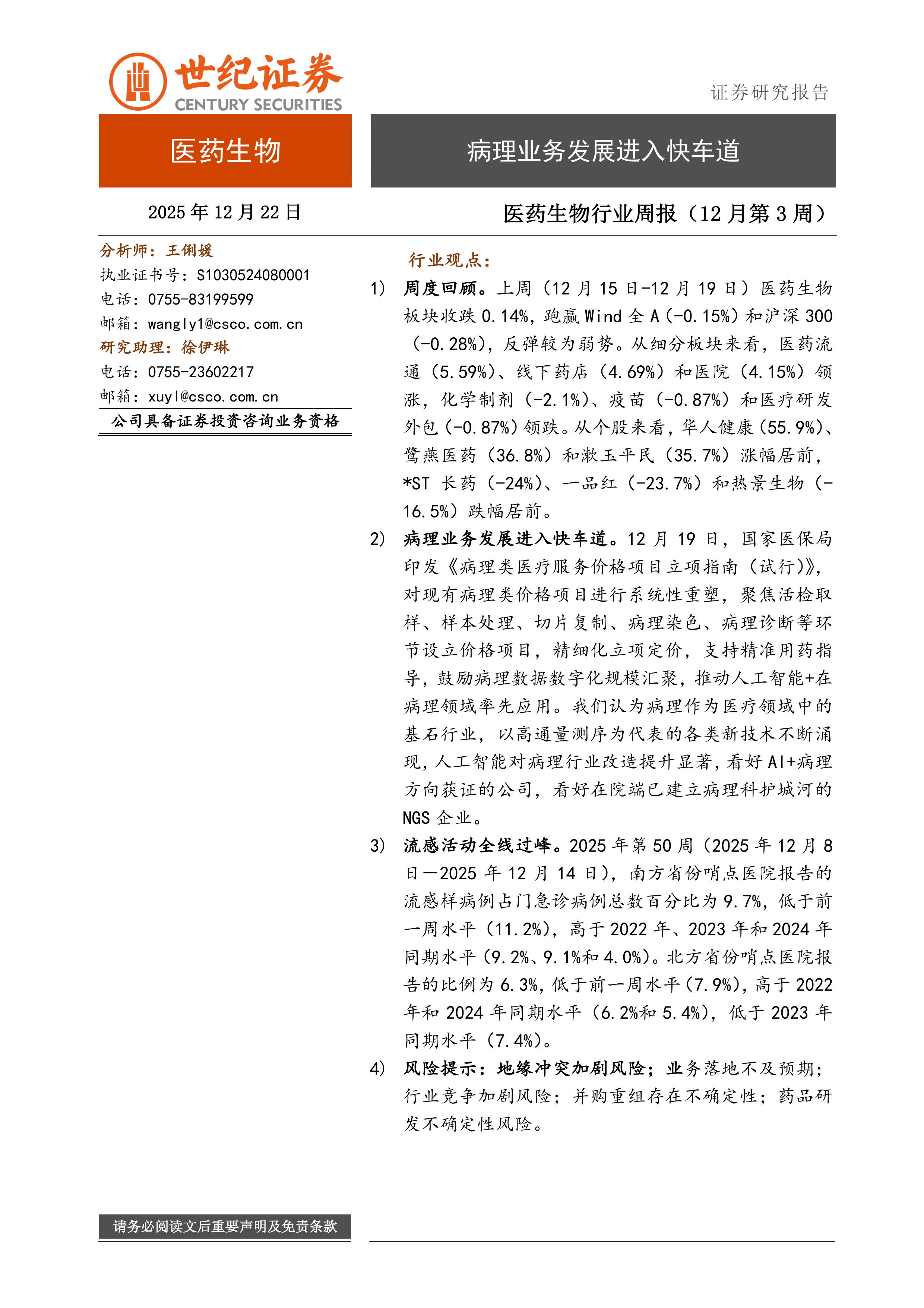 医药生物行业周报(12月第3周):病理业务发展进入快车道