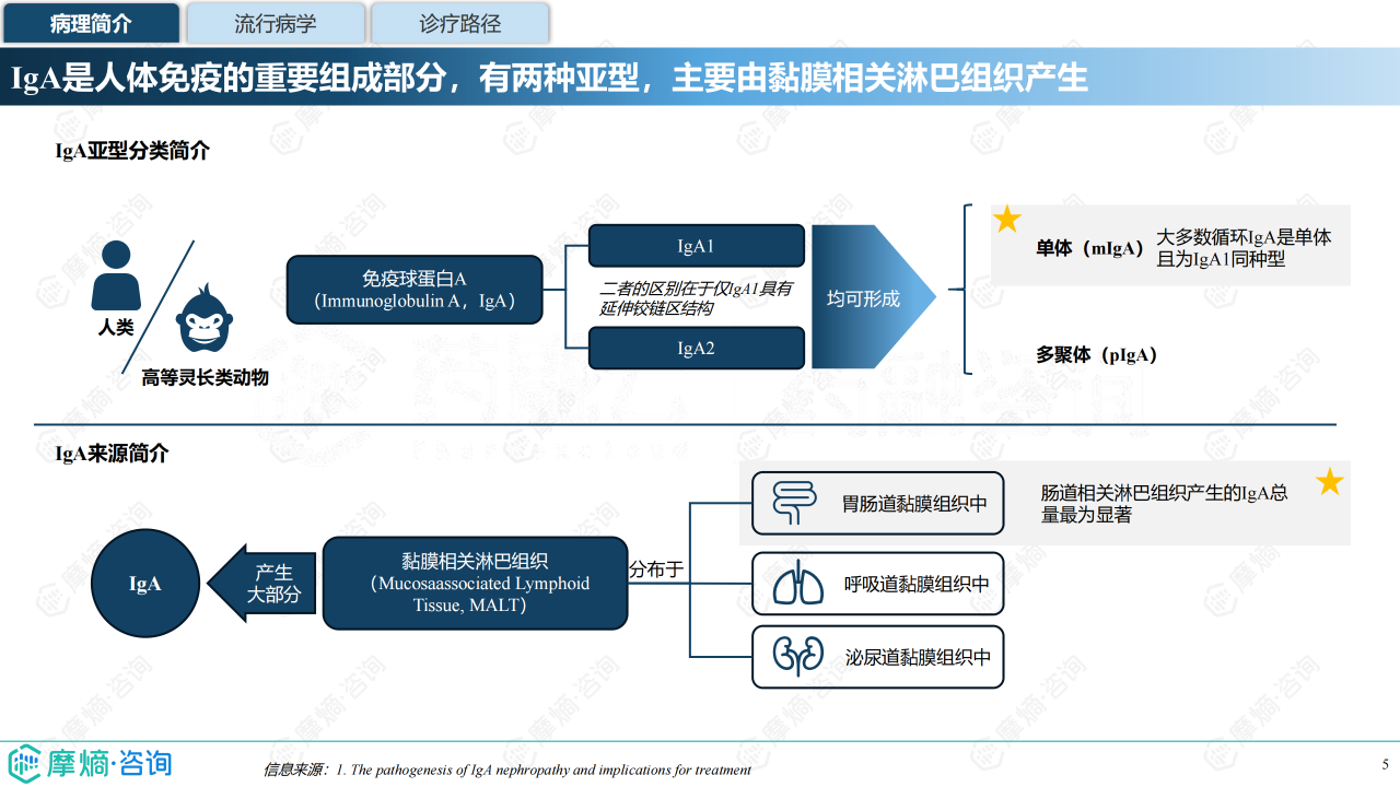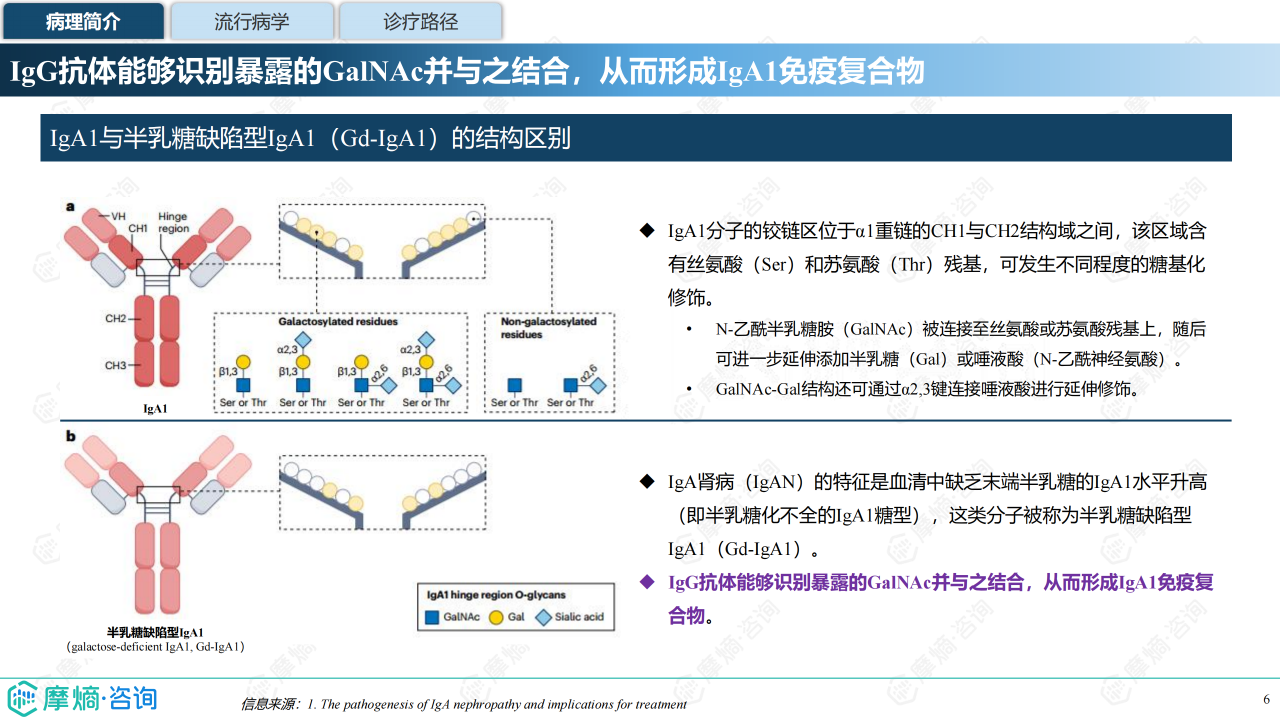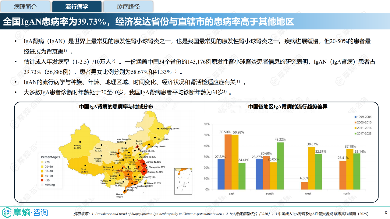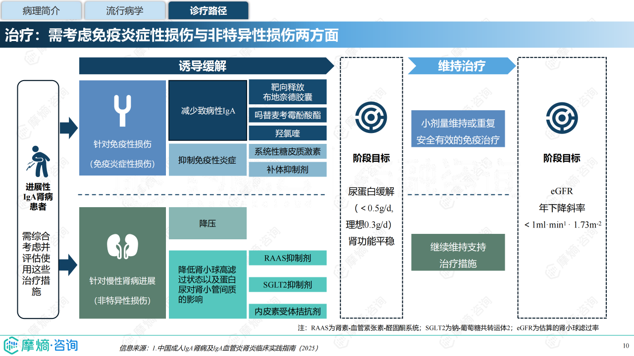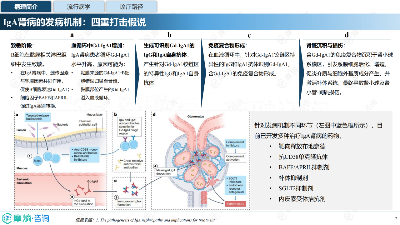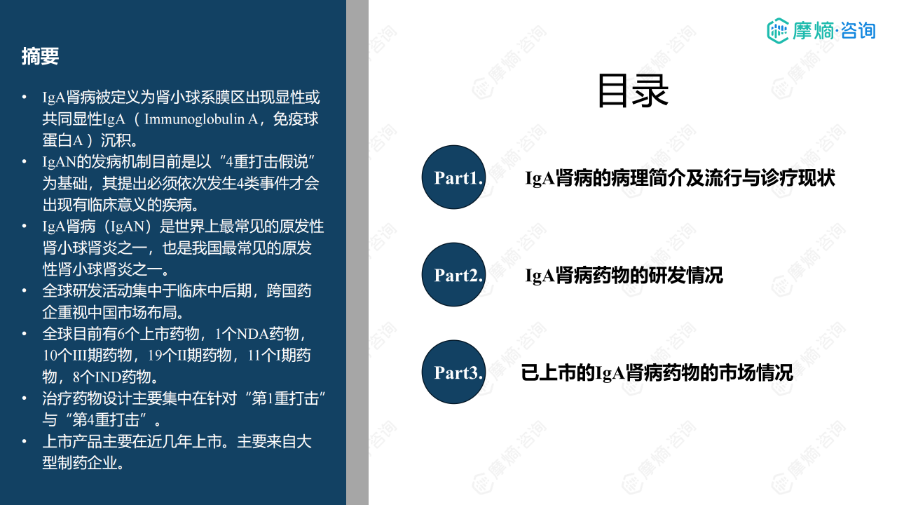 本报告聚焦 IgA 肾病药物研发全景与已上市药物市场竞争格局,介绍了 IgA 肾病的病理机制(四重打击假说)、流行病学特征(中国患病率 39.73%)及诊疗现状(肾活检为金标准)。全球 IgA 肾病药物研发集中于临床中后期,共6款药物上市、1款 NDA、10款 Ⅲ 期药物,研发靶点主要针对 “第 1 重打击”(Gd-IgA1 生成)与 “第 4 重打击”(肾脏沉积损伤)。已上市药物多为近年获批,跨国药企重视中国市场布局,布地奈德肠溶胶囊为中国唯一医保准入药物。报告还分析了伊普可泮、Sparsentan 等药物的全球及中国销售额、医保对市场放量的影响,展现了 IgA 肾病治疗从 “无药可用” 到 “多药可选” 的格局转变。