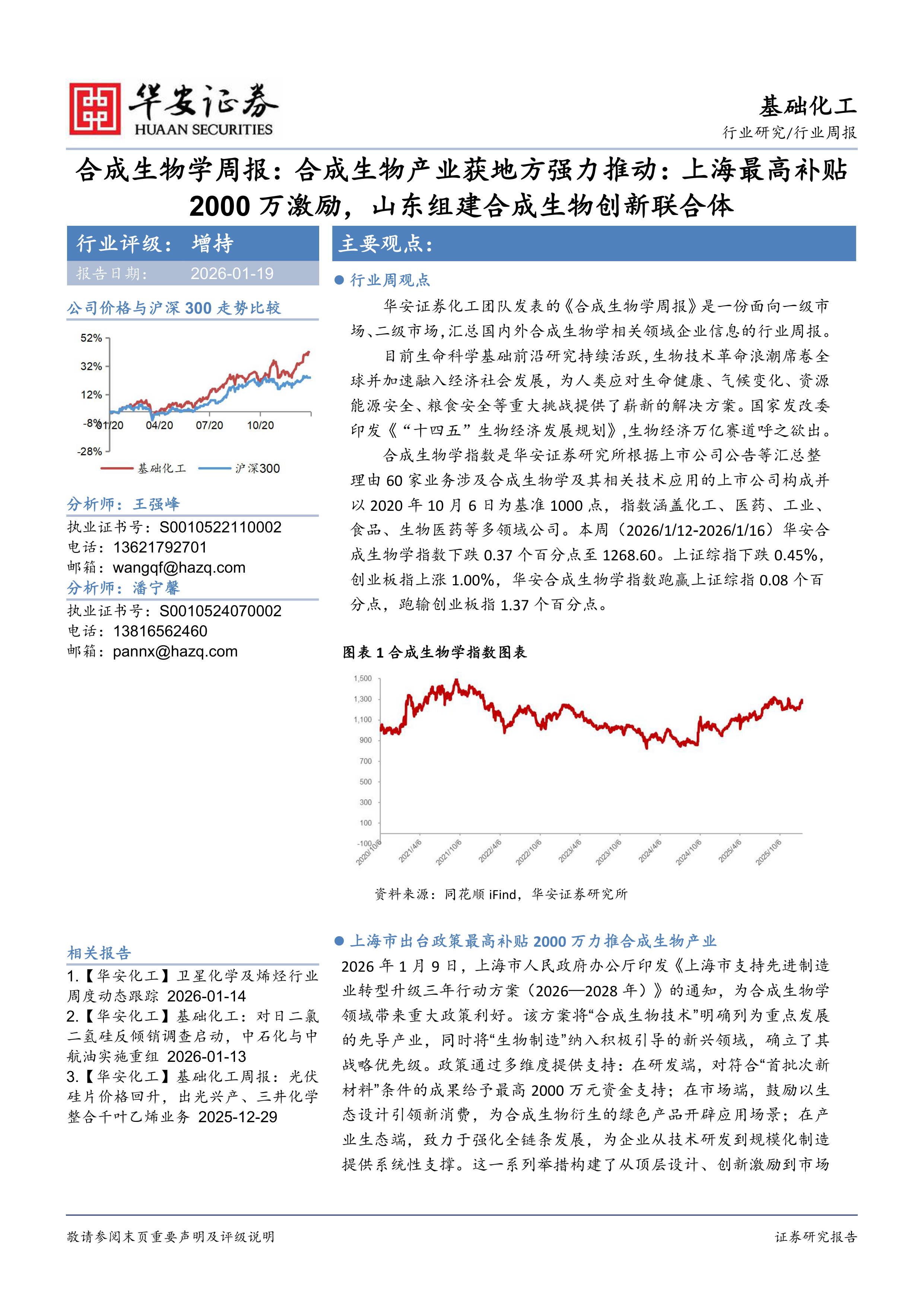 合成生物学指数是华安证券研究所根据上市公司公告等汇总整理由60家业务涉及合成生物学及其相关技术应用的上市公司构成并以2020年10月6日为基准1000点,指数涵盖化工、医药、工业、食品、生物医药等多领域公司。本周(2026/1/12-2026/1/16)华安合成生物学指数下跌0.37个百分点至1268.60。上证综指下跌0.45%,创业板指上涨1.00%,华安合成生物学指数跑赢上证综指0.08个百分点,跑输创业板指1.37个百分点。